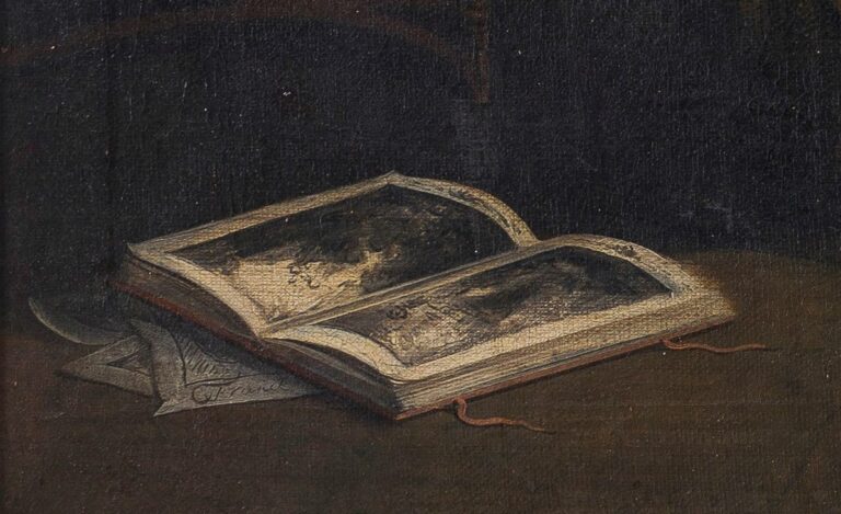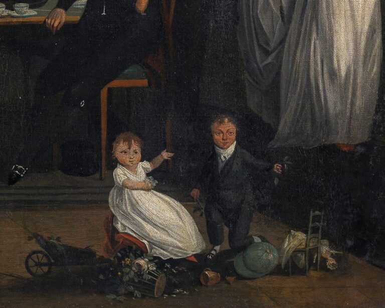 The present portrait is among Franck’s most accomplished portraits. An extensive group has assembled in an elegant interior, engaged in a variety of pursuits. Although the identity of the sitters is lost to time, the group appears to consist of two families, either two sisters or two brothers with their respective families. Two mothers sit in front of the fireplace, holding infants; they are flanked by two men, presumably their husbands, while three sons are portrayed by the gentleman in top hat. Two elder daughters in elegant dresses stand by the window, one holding a vase of flowers, and two toddlers are playing in the foreground, surrounded by toys, miniature furniture and flowers. The gentleman at the left stands by a piano, with an open volume on the floor in the foreground – it has been suggested that the book is the illustrated bible by Gerard Hoet, entitled Taferelen der voornaamste geschiedenissen van het Oude en Nieuwe Testament, published in The Hague in 1728.3 The prominent position of this bible may indicate that one of the gentleman in this portrait could have had a religious position. The artist’s signature appears on the drawn or printed papers underneath the volume.