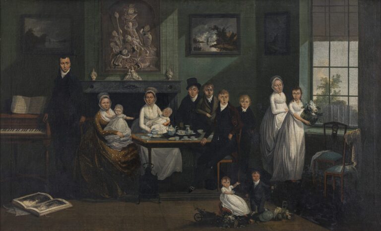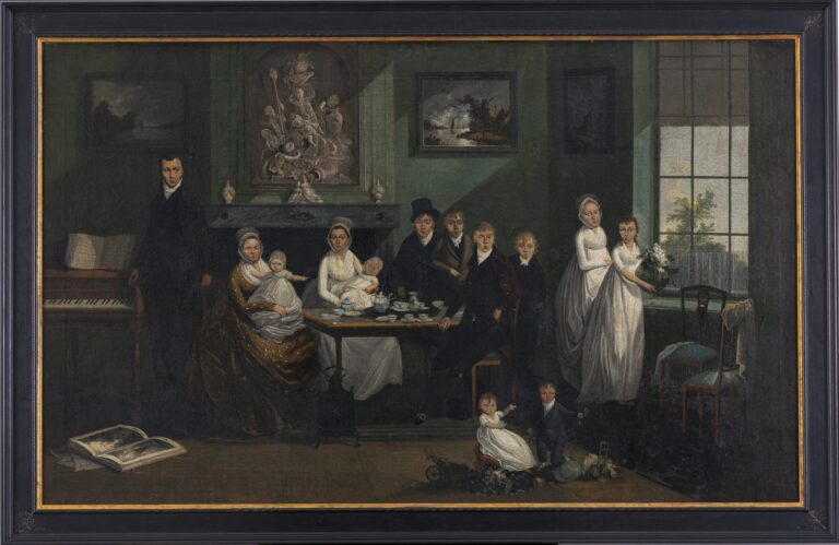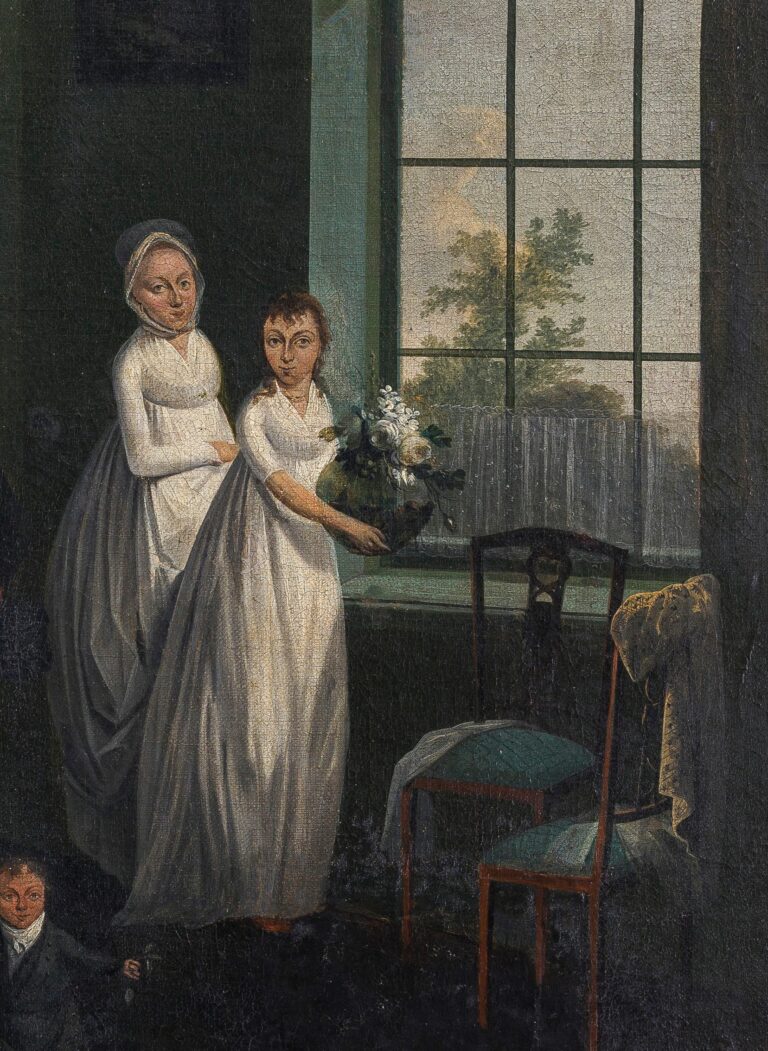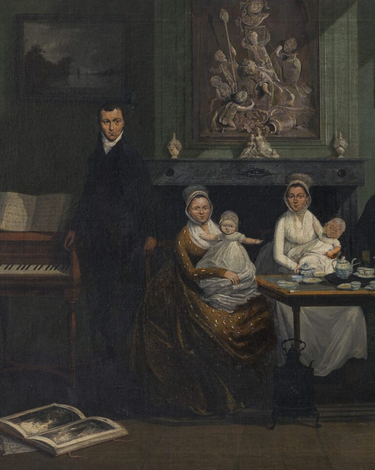 The interior of the room is depicted with as much precision as the family members. The woodwork and walls are painted green, a fashionable colour at the period. The marble fireplace would appear to date from circa 1770 and is of a type that was typical for the north-west region of The Netherlands. As has been observed by Charles Dumas, the grisaille chimney painting, depicting putti worshipping a bust of Bacchus on a pedestal, is painted in the manner of the Flemish artist Martinus Josephus Geeraerts (1707–1791), who was active in the Southern Netherlands and Zeeland and also supplied pieces to clients in the north of the country. The paintings on the left and right of the fireplace, reminiscent of works by Salomon van Ruysdael and Roelof van Vries respectively, which again would situate this interior in the environs of Haarlem, where Franck was active from 1806.4 The clothing of the sitters would indicate of date of around 1810.