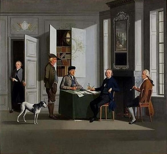 Our painting can for instance be compared to Franck’s portrait of the Leeuwarden merchants Reijnier Buysing (1743–1821) and Gerard Buijsing (1768–1820) and three other gentlemen, dated 1790, in the collection of the Fries Museum in Leeuwarden (fig.).5 It is also comparable to Franck’s group portrait of the Frisian noble Sminia family, shown around the table in the dining room of their country house De Klinze, circa 1790, which is in a private collection.6 A self-portrait by Franck is preserved in the Rijksmuseum in Amsterdam (fig.).7