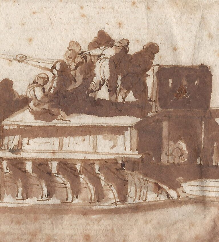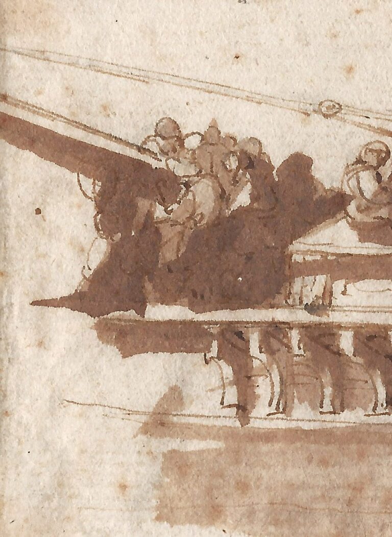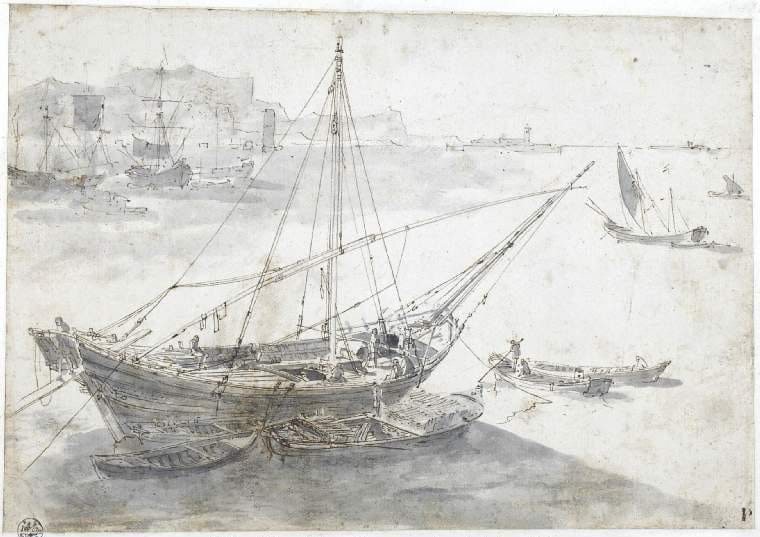 This small yet vigorous sketch belongs to a group of drawings depicting ships and harbour scenes that was owned in the middle of the eighteenth century by the Roman sculptor Bartolommeo Cavaceppi (c.1716–1799), and was purchased in 1844 by the Staatliche Museen in Berlin.1 Upon deaccessioning by the Berlin museum the group has been dispersed, with some sheets now in the Fitzwilliam Museum, Cambridge,2 and others in private collections.3