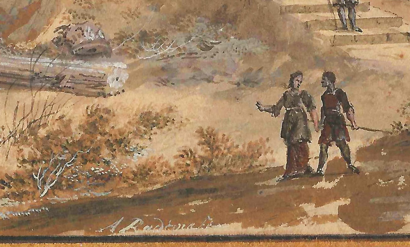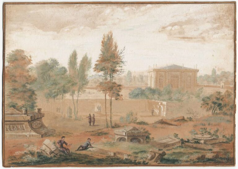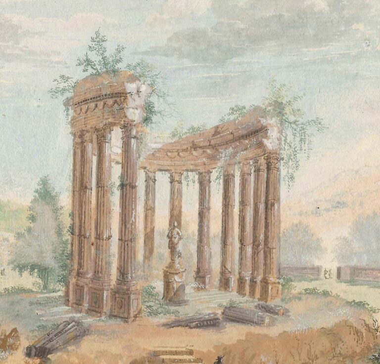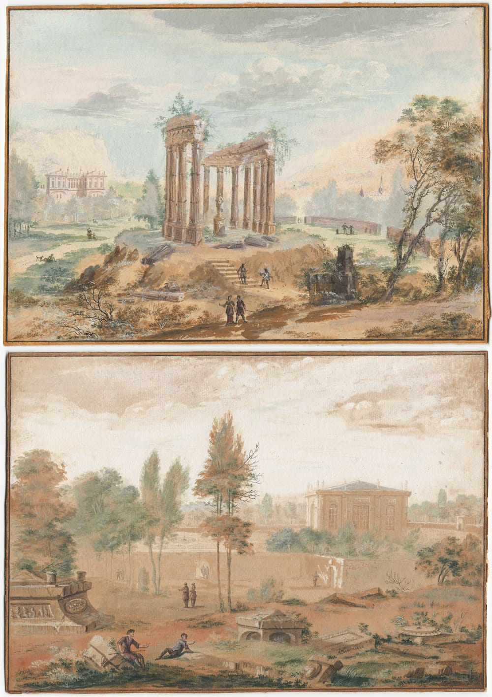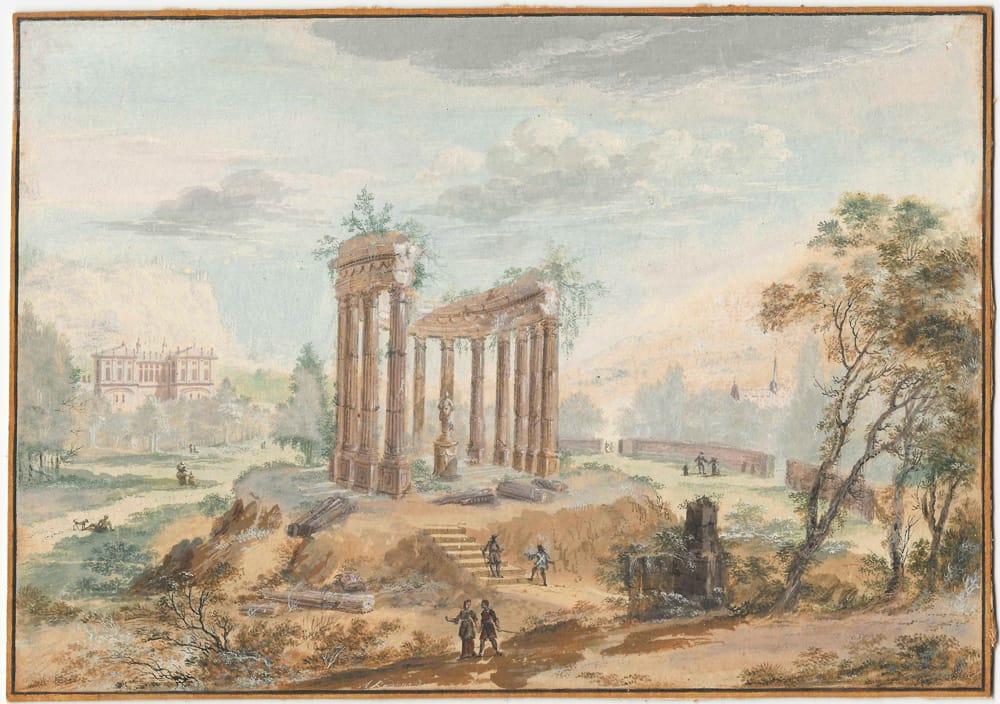 In this charming set of landscapes, Rademaker has excelled at creating Arcadian views of the sort that was so adored during the Silver Age of the 18th century. In both, country houses reminiscent of Amsterdam’s City Hall by Jacob van Campen are set in Italianate landscapes with half-overgrown Classical ruins, columns and monuments, while the attractive circular temple recalls the Temple of Hercules Victor in the Forum Boarium in Rome. However, Rademaker has turned all these ingredients into a world which is entirely his own and immediately recognisable. Our landscapes can be compared to an example in the Rijksmuseum, Amsterdam (see fig.).3 A further comparable work is in the Graphische Sammlung of the Städelsches Kunstinstitut in Frankfurt.4