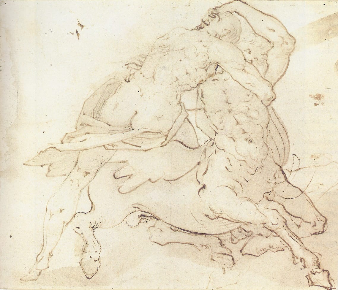 Professor DaCosta Kaufmann has however proposed that our drawing can be dated to the Florentine apprenticeship in Giambologna’s studio, pre-dating the Prague period, which would make it the earliest of De Vries’s known works on paper.2 Professor DaCosta Kaufmann remarks on the following characteristics as typical for De Vries’s draftsmanship: “the peculiar notch-shaped indentations”, “the abundant use of wash to model figures”, and “one feature that I find especially close to De Vries is the way in which heavy marks of the pen are used to define eyebrows and eye sockets: these are seen in De Vries’s drawing of Hercules Pomarius in Prague” (fig.).3 Another drawing which is highly similar in handling and compositional conception is the Hercules and Centaur in Budapest (fig.).4