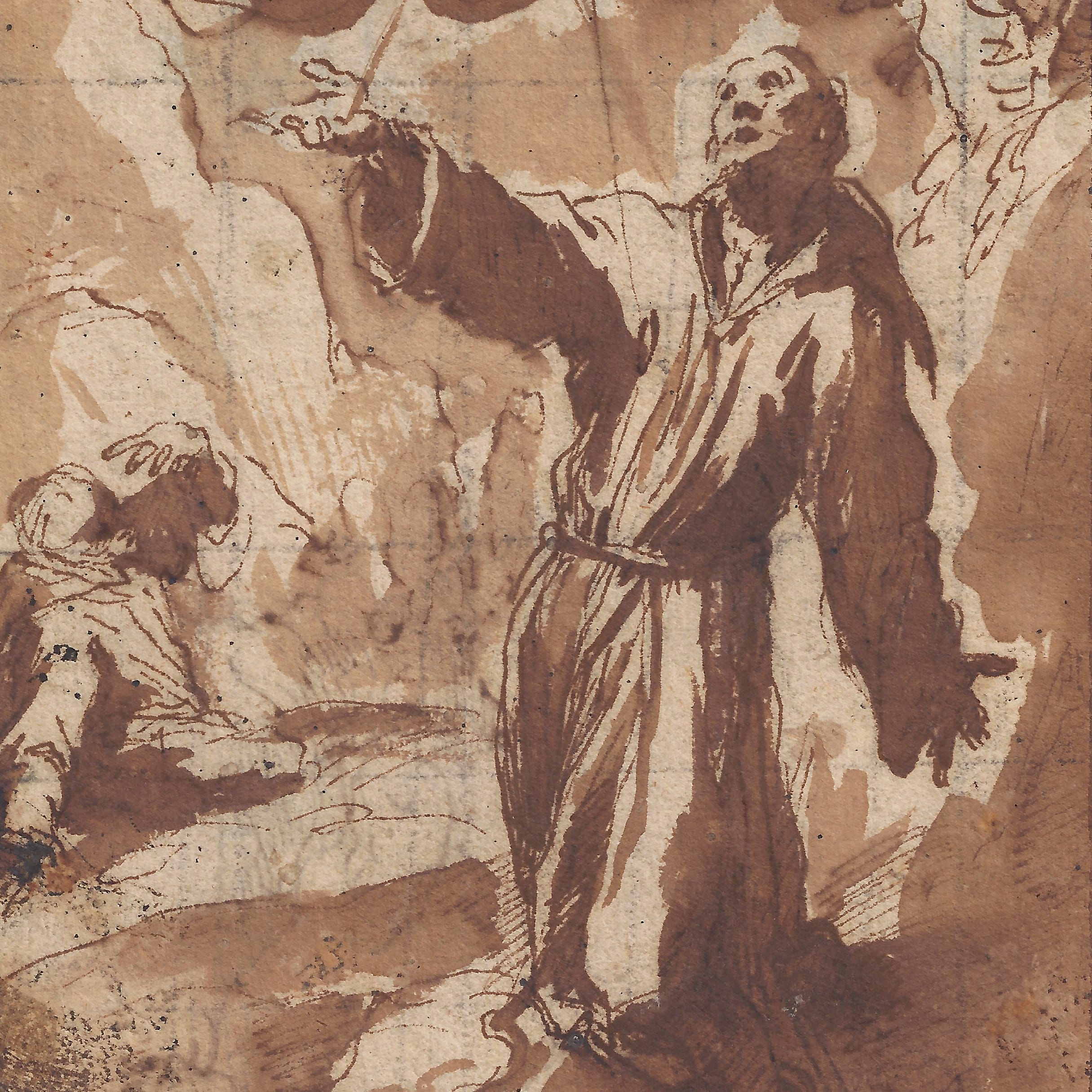 Our powerful drawing of The Stigmatisation of St Francis, with its strong chiaroscuro effects, is a particularly painterly sheet – the washes applied by the draftsman strongly contribute to the dramatic effect. The black chalk squaring suggests the design was intended to be transferred to larger size, presumably for a painting, although a finished work of this composition has not been identified. The handling of our sheet is comparable for instance to Lanfranco’s Virgin and Child Accompanied by a Saint Appearing to a Monk in the Royal Collection at Windsor Castle (fig.).3 Nicholas Turner has observed that the composition shows an awareness of Federico Barrocci’s famous painting of the subject, executed c.1594-95 and now in the Palazzo Ducale, Urbino (fig.). I am very grateful to Nicholas Turner for his valuable comments on this drawing.