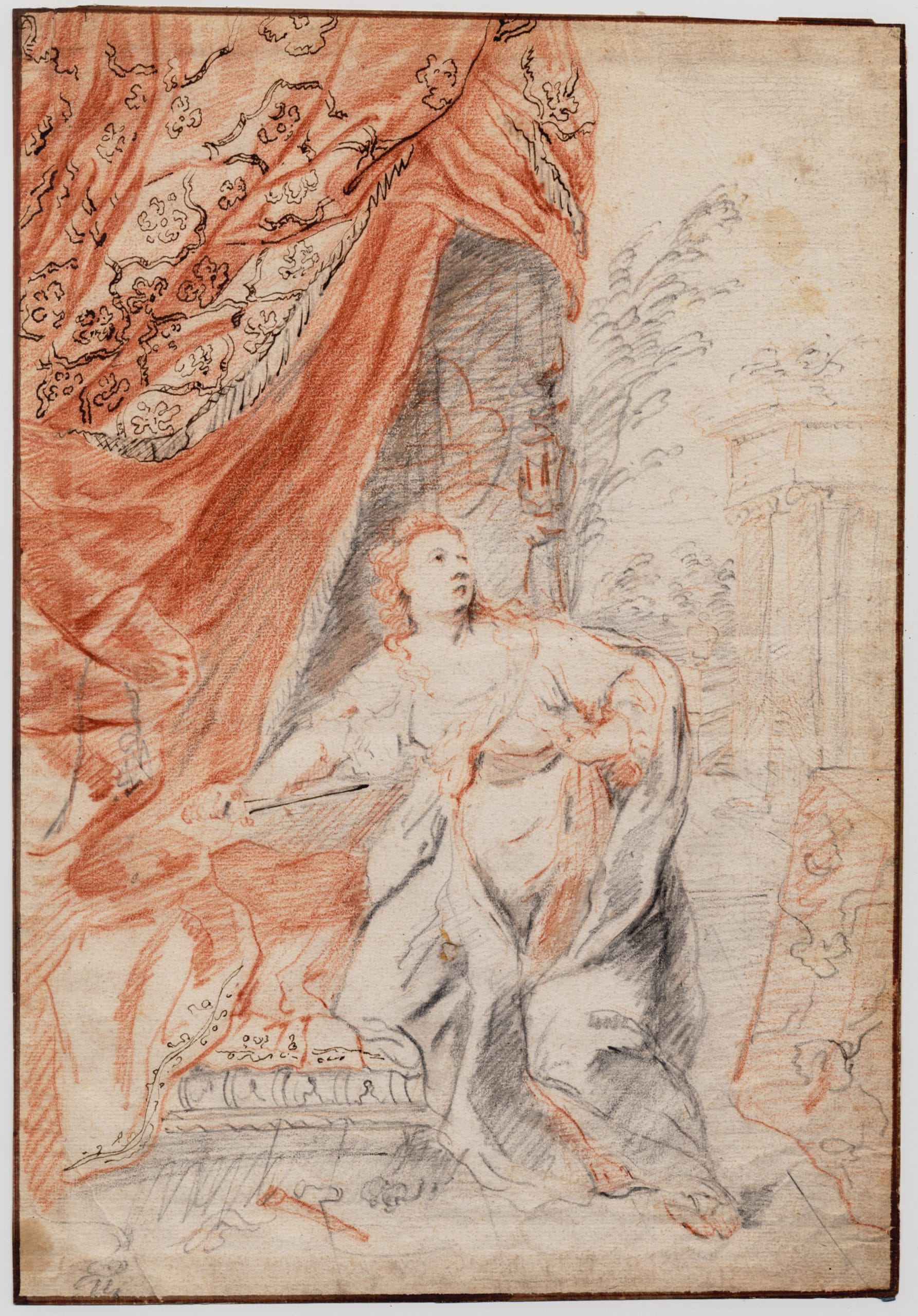 Marjorie Wieseman, the leading expert on the artist, has identified around 45 drawings by Netscher, which she characterizes as ‘fluent and sure’.1 They range in function from quick preparatory sketches to elaborately executed modelli and ricordi. A modello is a presentation drawing which an artist could present to a potential client to show what a finished painting would look like, whereas a ricordo was executed after a painting was finished, recording it, either for the artist’s own archive or as a courtesy for the painting’s owner. Although it is often difficult to distinguish between modelli and ricordi, our drawing would seem to fall in one of these two categories. The combination of red and black chalk and especially the incidental use of brown ink defining the sharpness of the dagger’s blade and the patterning of the damask curtain are highly evocative.