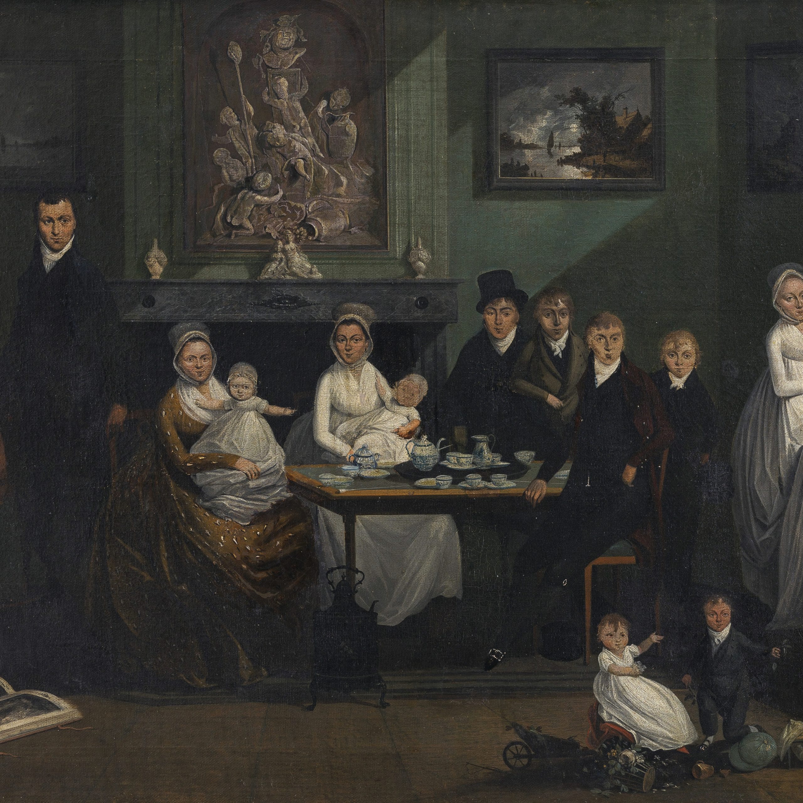 The interior of the room is depicted with as much precision as the family members. The woodwork and walls are painted green, a fashionable colour at the period. The marble fireplace would appear to date from circa 1770 and is of a type that was typical for the north-west region of The Netherlands. As has been observed by Charles Dumas, the grisaille chimney painting, depicting putti worshipping a bust of Bacchus on a pedestal, is painted in the manner of the Flemish artist Martinus Josephus Geeraerts (1707–1791), who was active in the Southern Netherlands and Zeeland and also supplied pieces to clients in the north of the country. The paintings on the left and right of the fireplace, reminiscent of works by Salomon van Ruysdael and Roelof van Vries respectively, which again would situate this interior in the environs of Haarlem, where Franck was active from 1806.4 The clothing of the sitters would indicate of date of around 1810.
