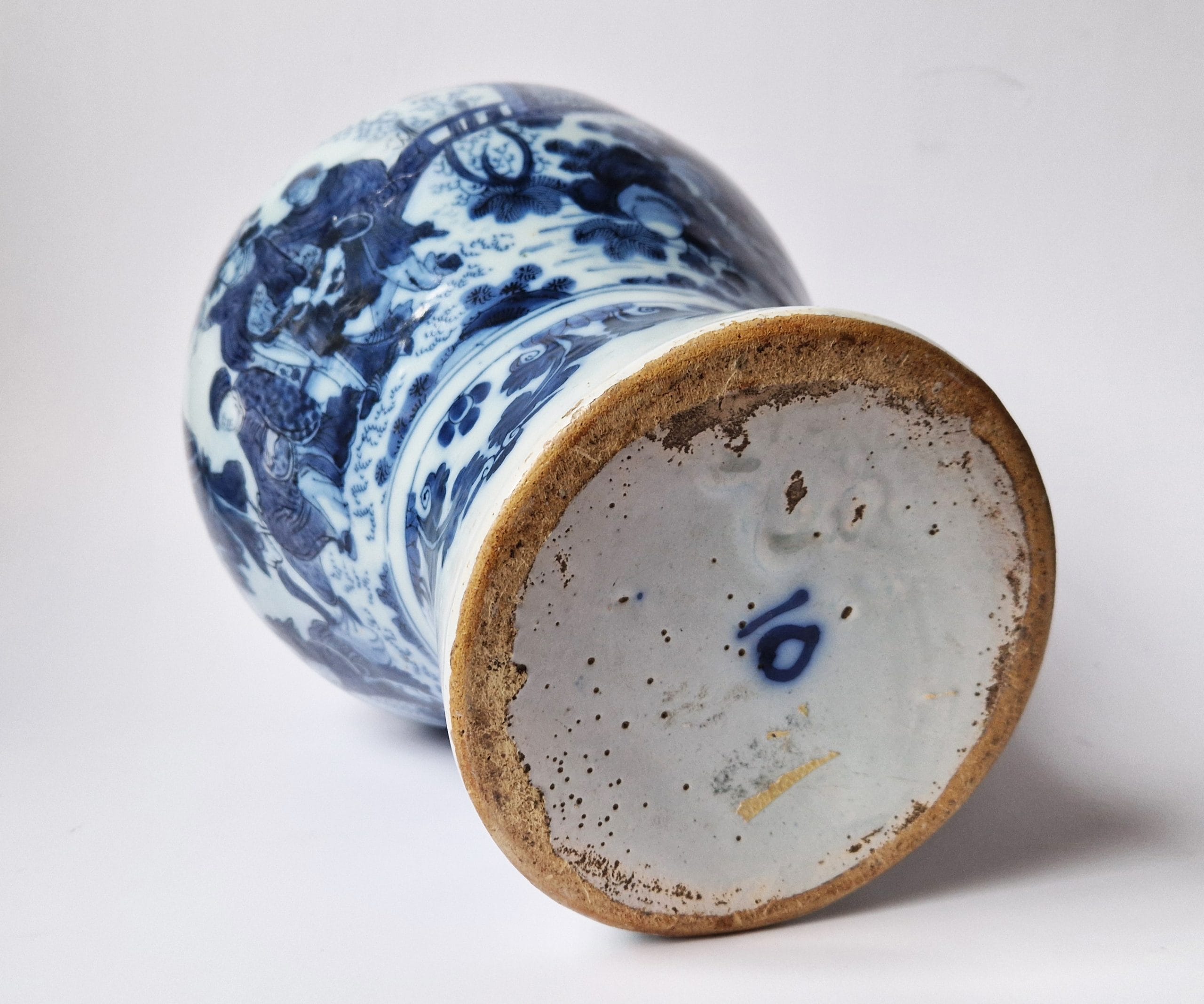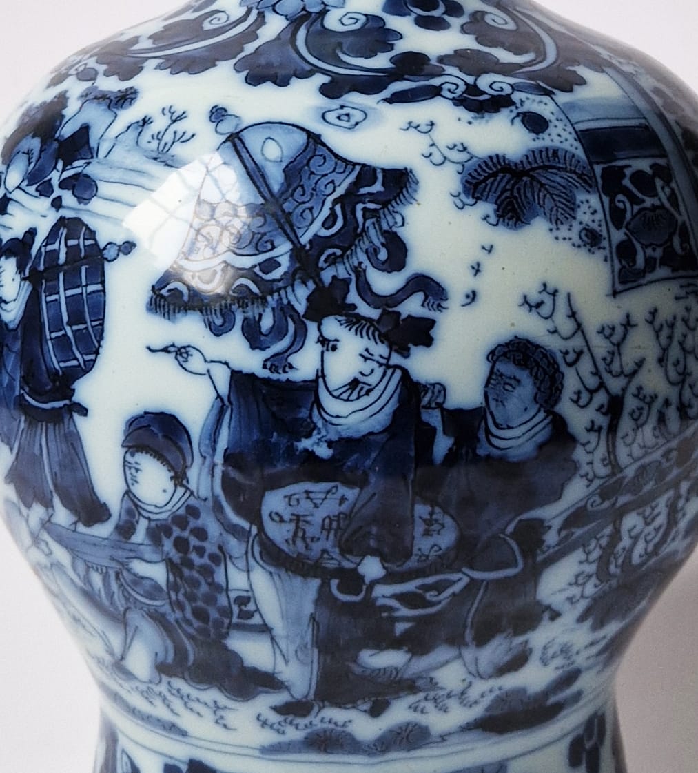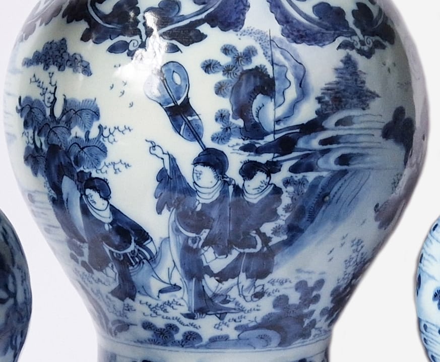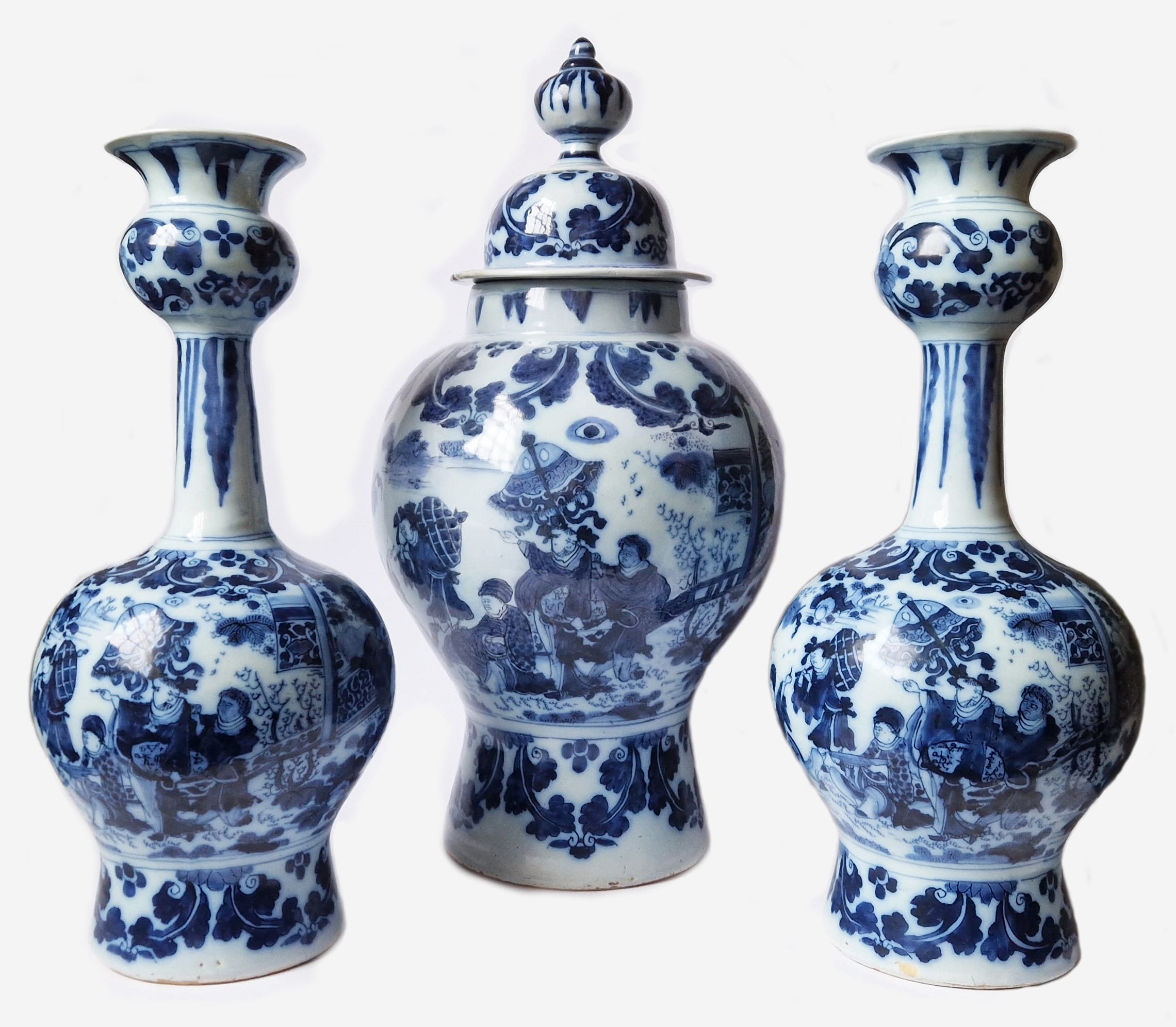 This garniture of two bottle vases and one lidded vase is decorated in blue with identical extremely rare scenes of a dignitary attended by a Black servant carrying a parasol on one side, and a more usual scene of a dignitary attended by an Oriental servant holding a fan on the other side; a similar scene with an Oriental attendant occurs on a charger by the De Metaale Pot Delft factory of circa 1680-1690 in the Rijksmuseum in Amsterdam.1 Painted in Delft around 1680-1700, such decorations were strongly influenced by Chinese models from the Transitional Period and by Japanese imitations of such Chinese models, which were imported in great numbers by the VOC, the Dutch East India Company. It appears, however, that the introduction of Black servants was an original Dutch invention, as such coloured people are not recorded on Chinese or Japanese examples.