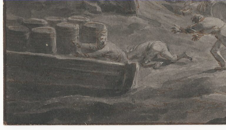 Dirk Langendijk was a pupil of Dirck Anthonie Bisschop, an interior decorator and a painter of coats of arms and coaches.1 From the beginning of his career Langendijk depicted primarily military scenes. As his career progressed he drew inspiration for these military scenes from the Dutch conflict between the Patriots and the Orangists, and from the invasions of the Dutch Republic by the French and Anglo-Russian armies in 1795 and 1799 respectively. Langendijk’s style is characterised by a concentration on crowds rather than individuals, which makes the present work a rarity in his oeuvre. In his military scenes, we typically see the interaction between groups of officers and soldiers before and during battle. However, as well as military scenes, Langendijk also depicted many scenes of coastal life, such as the Courtauld Gallery’s Shipping in a Storm off the Coast. He executed many of his works without pencil and pen, often just drawing with a brush.