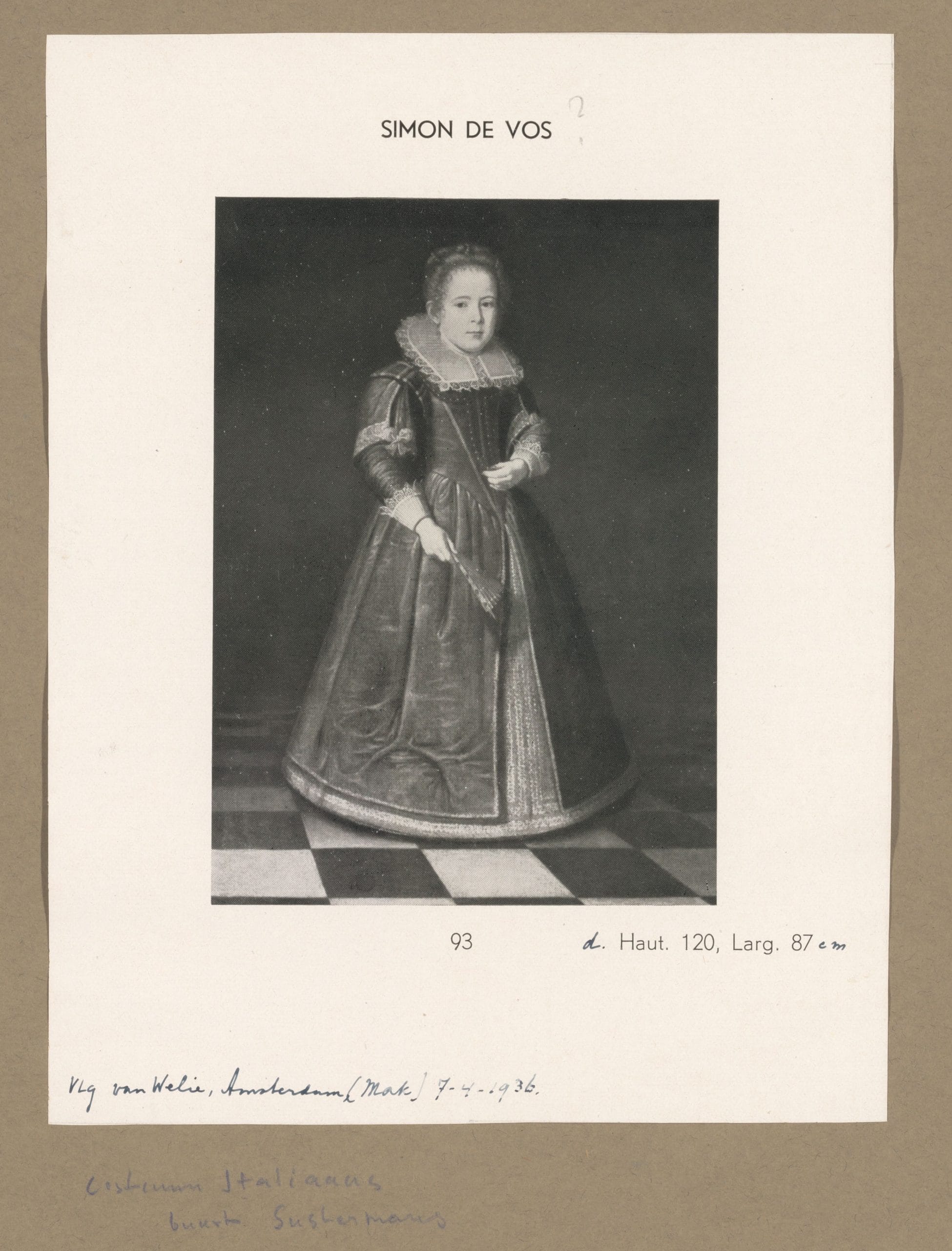This charming full-length portrait of a young girl, wearing a richly trimmed dress and lace collar and holding a fan, shows the juvenile sitter standing on a black and white chequered stone floor, casually beholding the viewer. In the early twentieth century the portrait was part of the collection of the Dutch society portrait painter Antoon van Welie (1866–1956). When it was sold from his collection, it was catalogued as a work by Simon de Vos – in fact, the auctioneers must have meant the Antwerp portrait painter Cornelis de Vos (Hulst c.1584 – 1651 Antwerp), who painted several portraits of children. However, the handling of our mysterious portrait does not quite match with De Vos’s technique, and an alternative attribution to Justus Sustermans (Antwerp 1597 – 1681 Florence) has also been suggested.