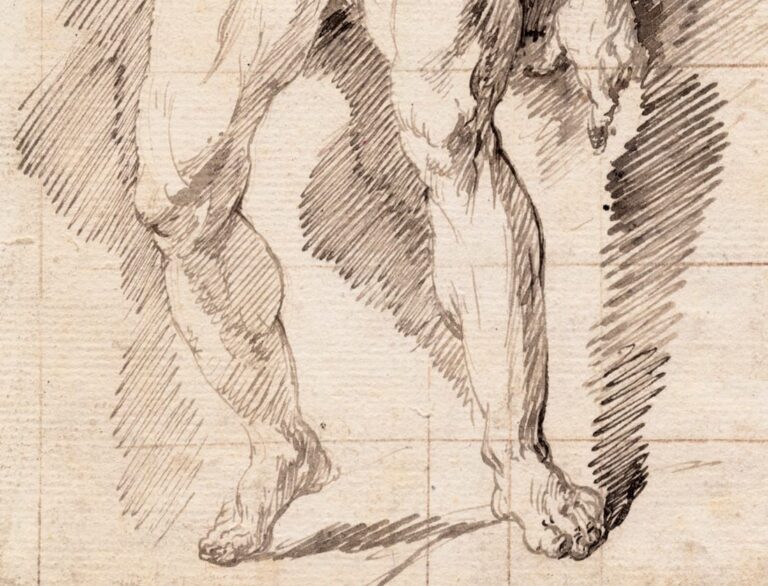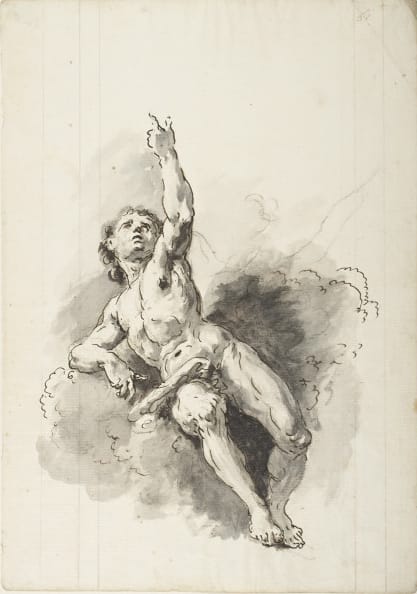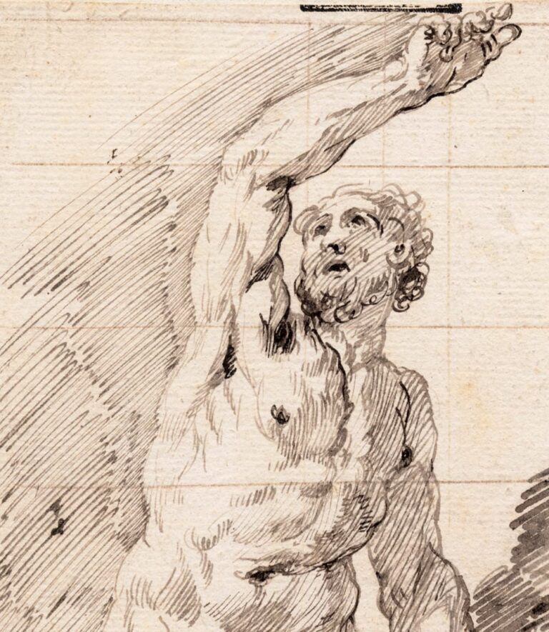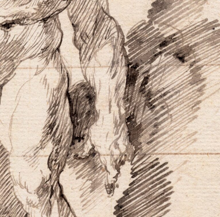 Fontebasso produced pen-and-wash drawings inspired by Tiepolo, and his drawings in pen and ink, such as the present work, are highly distinctive. It has been noted by Marina Magrini2 that the pose of our figure derives from the antique statue known as the Borghese Warrior (fig.).3 She further suggested that a drawing by Fontebasso in pen and wash in Princeton was also inspired by the same sculpture (fig.).4