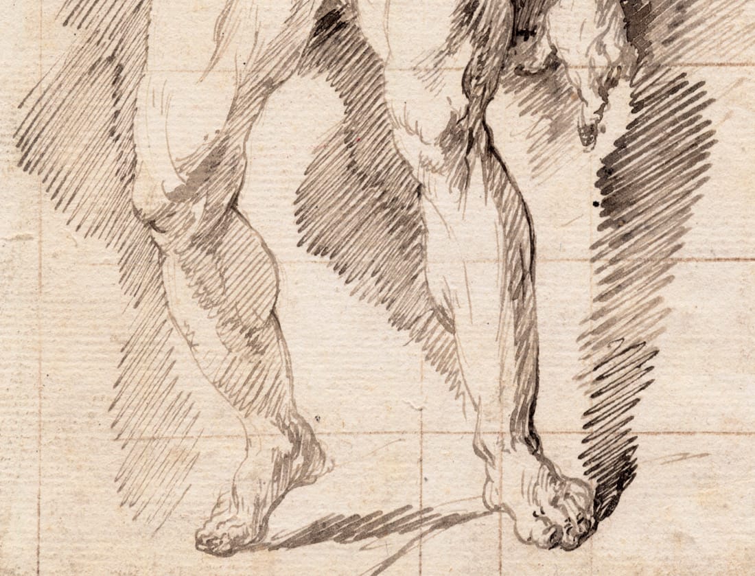 Pen and grey-brown ink, squared in brown chalk, partial framing lines in graphite, watermark three crescent moons, 285 x 171 mm (11.2 x 6.7 inch); laid down onto an 18th-century sheet of paper with framing lines in brown ink and watermark crowned shield