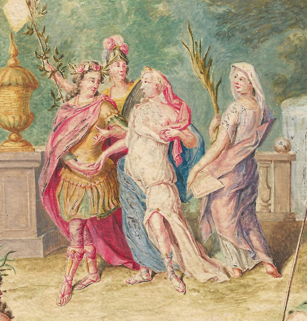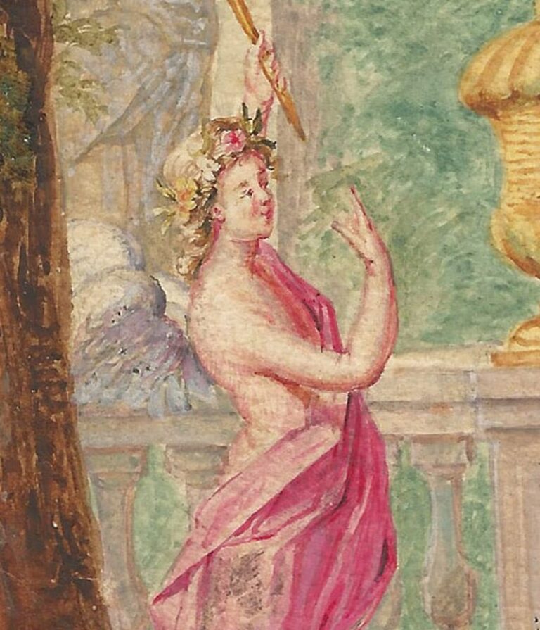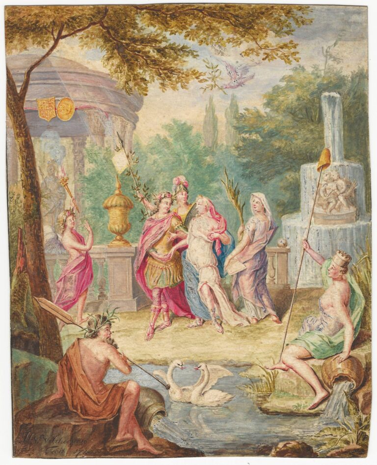 In this carefully executed gouache, proudly signed and dated by the artist, Van Velthoven has depicted an enchanting garden, adorned with a fountain and a circular Classical temple in the background. In the centre of the composition a gentleman and lady are shown dressed in Classical robes, and appear to the in the process of a wedding ceremony, overseen by the Goddess Minerva behind them, and accompanied by female mythological figures and river gods in the foreground, while a dove carries an olive branch in the skies above. It is possible that this sheet was executed to celebrate an actual wedding ceremony by one of Van Velthoven’s patrons.