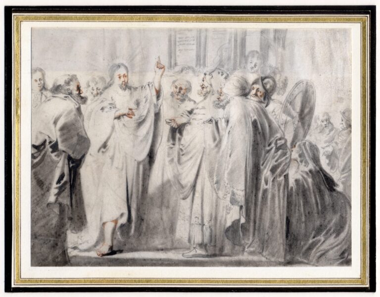 The subject is taken from the New Testament. The Pharisees ask Christ whether it is right to pay tax to the Romans. Christ, sensing the trap, asks whose likeness and name are on the coinage: ‘They say unto him, Caesar’s. Then he saith unto them, render therefore unto Caesar the things that are Caesar’s; and unto God the things that are God’s’ (Matthew 22; Mark 12, Luke 20).