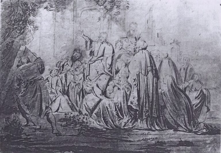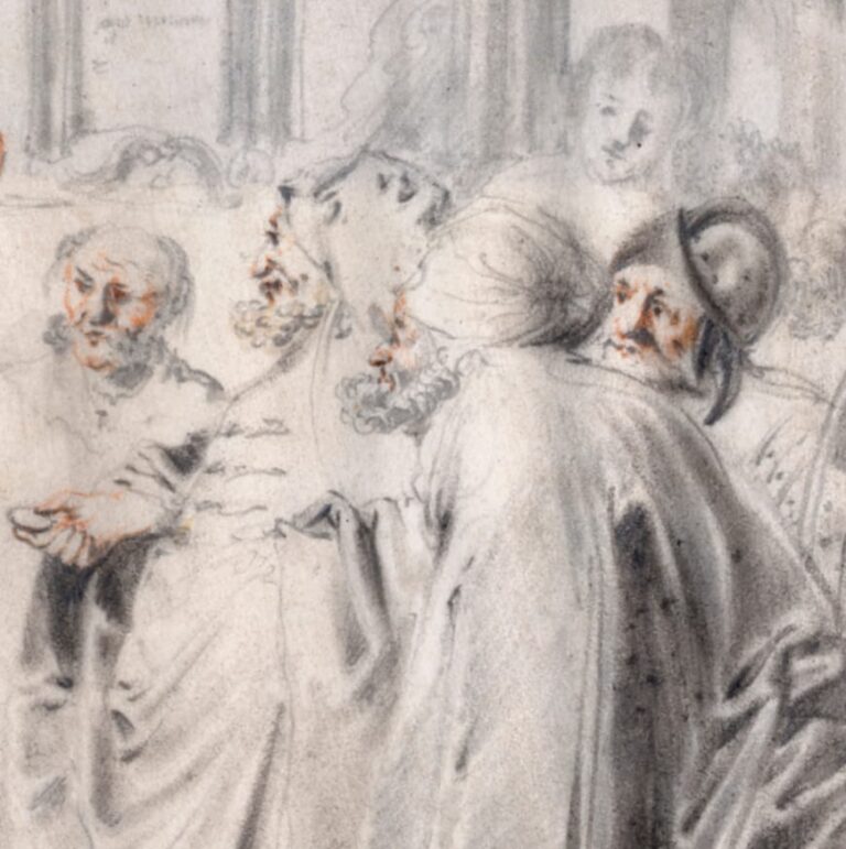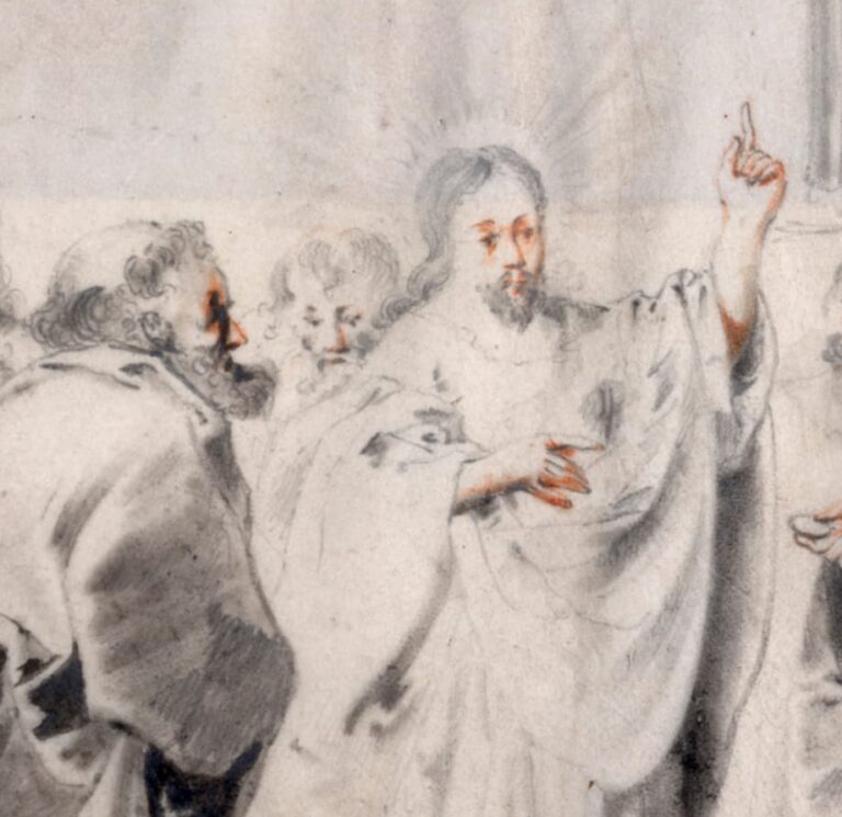 Our beautifully preserved sheet is typical of Hogers’s drawn oeuvre: all his known drawings are executed on vellum, in pen and wash in grey or black, and with accents in red on hands and faces, and take subjects from biblical history as their inspiration. About a dozen drawings are known, most in international museums. Our drawing may be compared to the Raising of Lazarus in the Rijksmuseum, Amsterdam (fig.).4 Hogers’s drawings must have been highly valued during his lifetime: the Deventer mayor Wilhelm Gelinck owned no less than six drawings on vellum by the artist.5