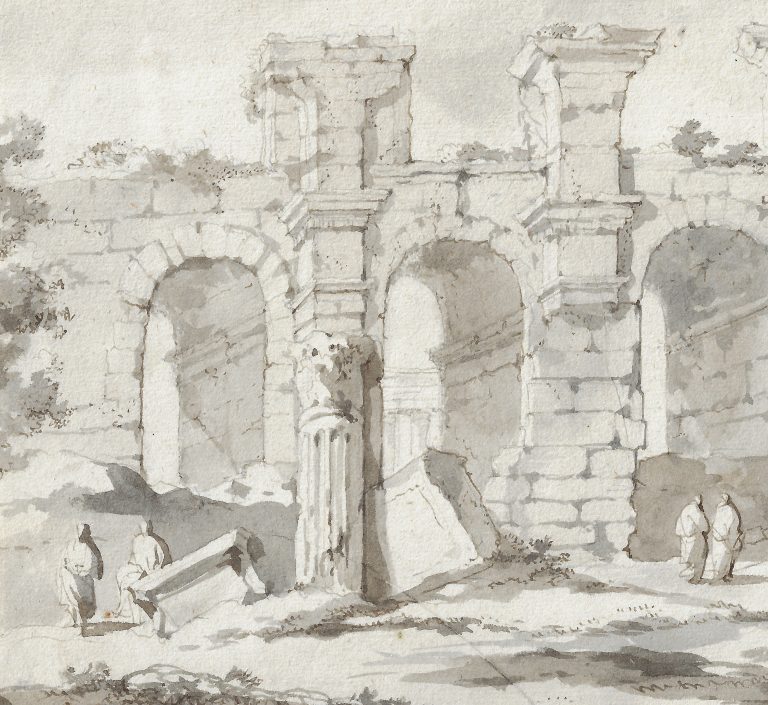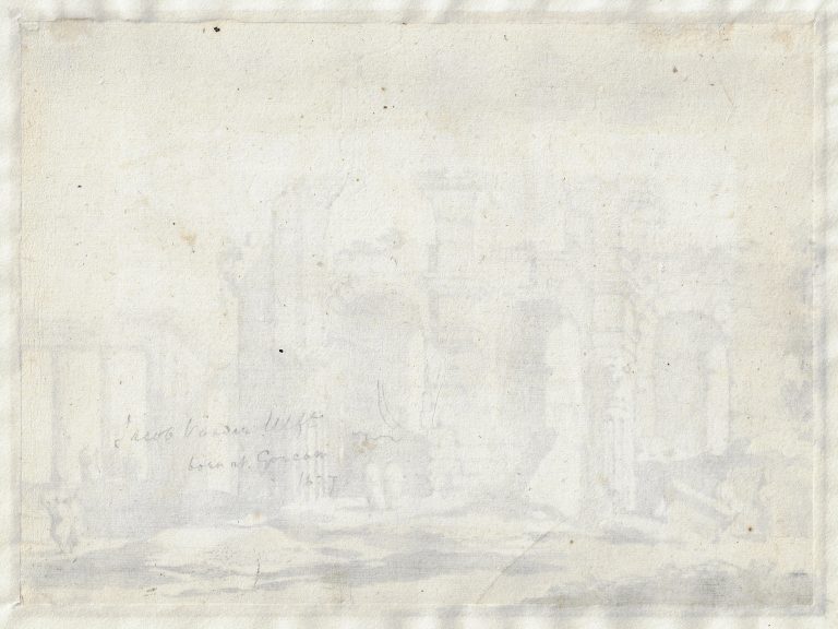 The present drawing may depict the Baths of Caracalla in Rome, very painterly rendered. It is rare among Van der Ulft’s drawings for being signed. In terms of execution it can be compared to the artist’s drawing View of the Forum Boarium in Rome in the Rijksprentenkabinet (fig.).5