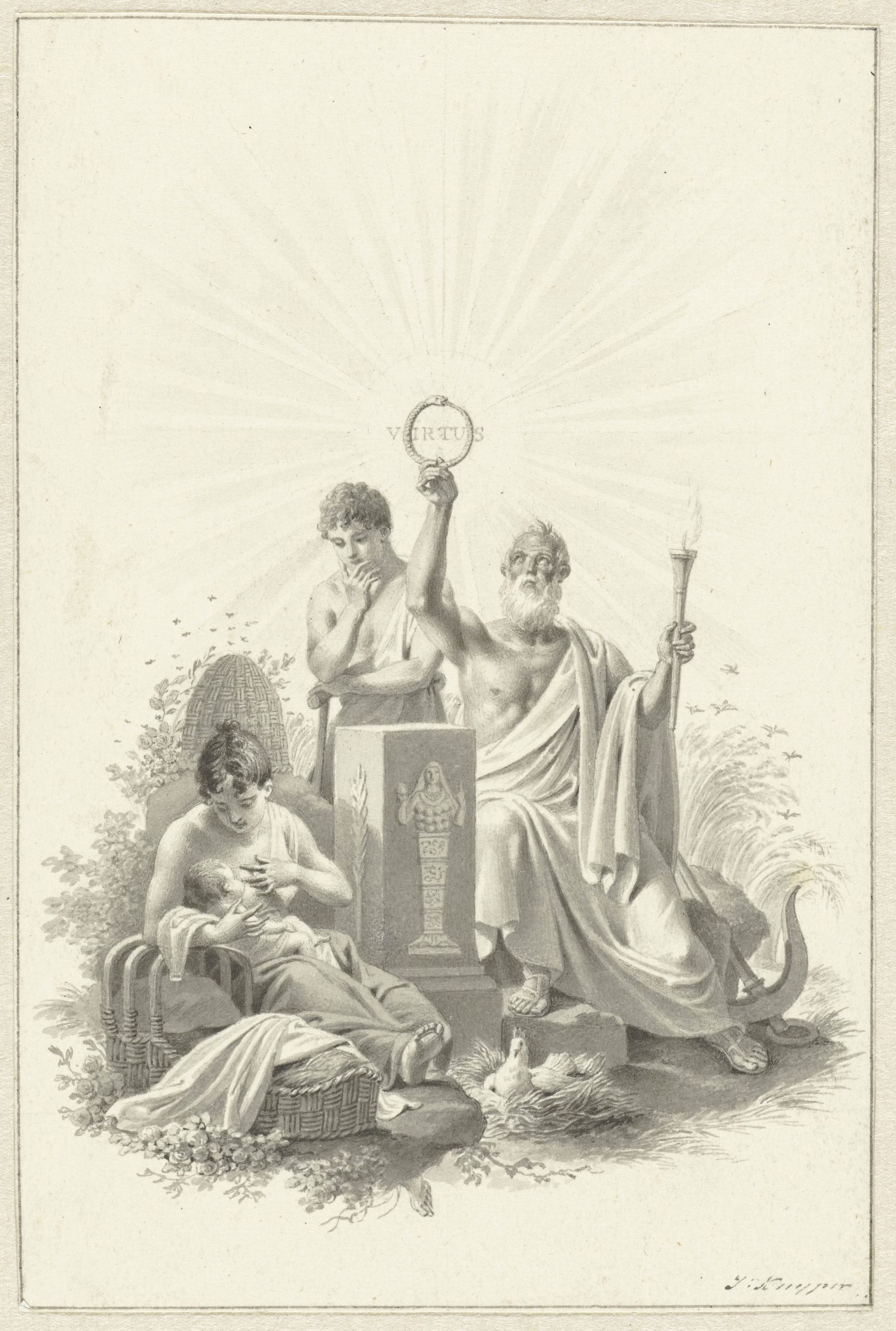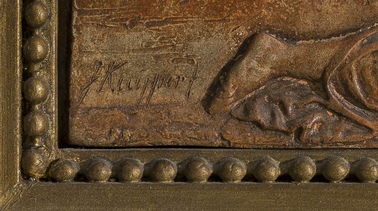 To date, Kuyper has only be known as a draughtsman, etcher and designer of book illustrations, predominantly in the Neoclassical manner, although sculptures by him are known from literature.4 A typical example is his design for the frontispiece of Willem Bilderdijk’s De Mensch of 1807, preserved in the Rijksprentenkabinet in Amsterdam (fig.).5 The signatures of his known drawings are generally highly comparable to the signature in our newly discovered terracotta relief, which is the first sculpture known by the artist. It is interesting that the portrait of Kuyper by the unidentified artist Marsinger of 1793 shows him surrounded by Classical casts and sculptures, which illustrates Kuyper’s love of the art of sculpture (fig.).6 In a more general context, Dutch sculpture from this period is exceptionally rare, as the number of active sculptors declined rapidly after the middle of the eighteenth century. A rare exception in the collection of the Rijksmuseum in Amsterdam is a terracotta relief of three putti with the emblem of the Felix Meritis society by Pieter Luypen (1763–after 1833).7