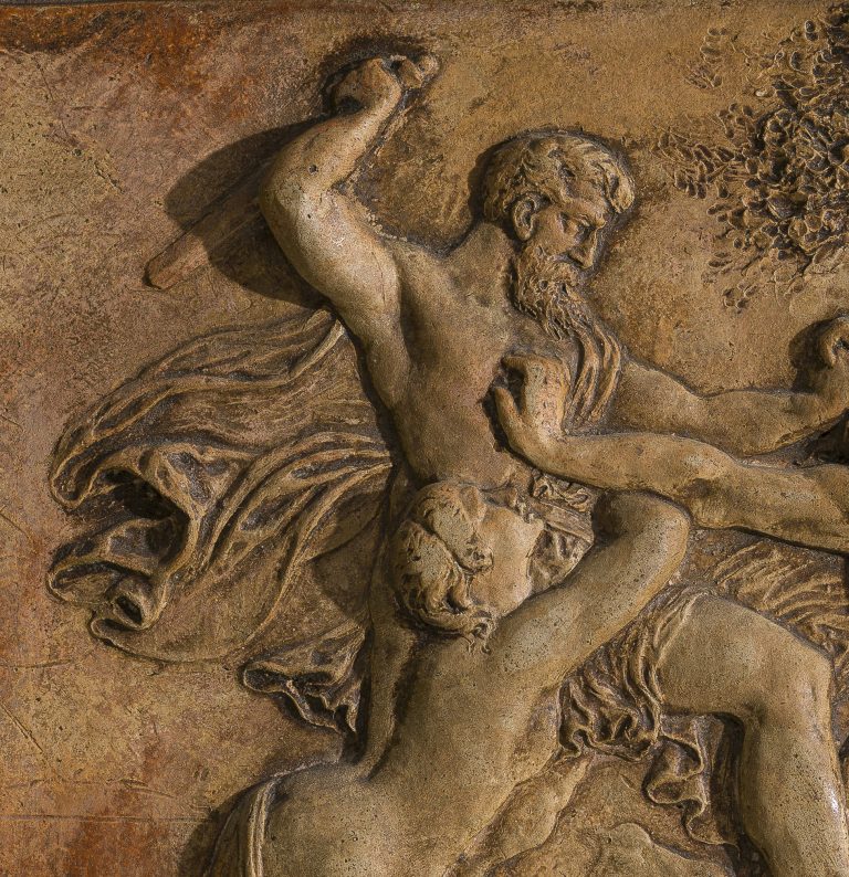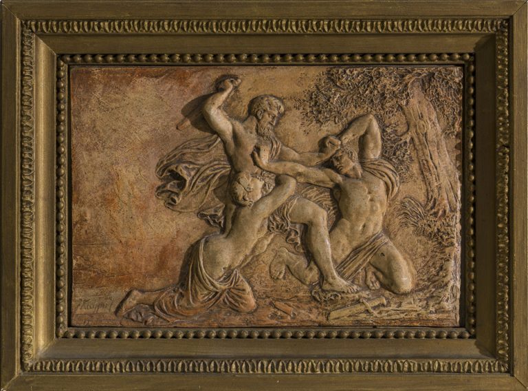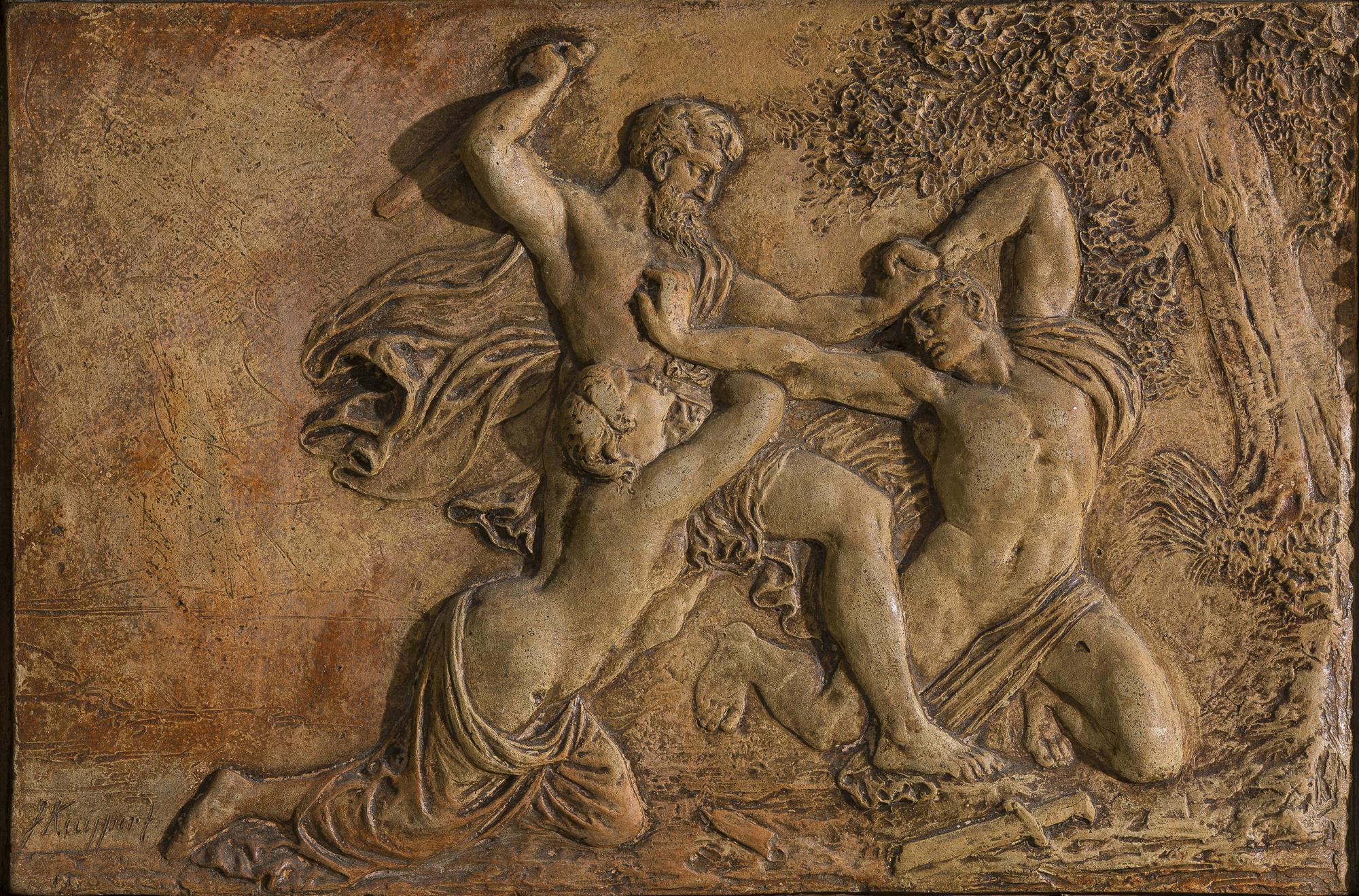 The theme, which is iconographically related to depictions of Caïn and Abel and Simson and the Philistine, should probably be interpreted in a more general way as two men fighting over a woman, presumably the woman’s father and her lover. It enabled the artist to show his capability in depicting the human form and complicated compositions.8