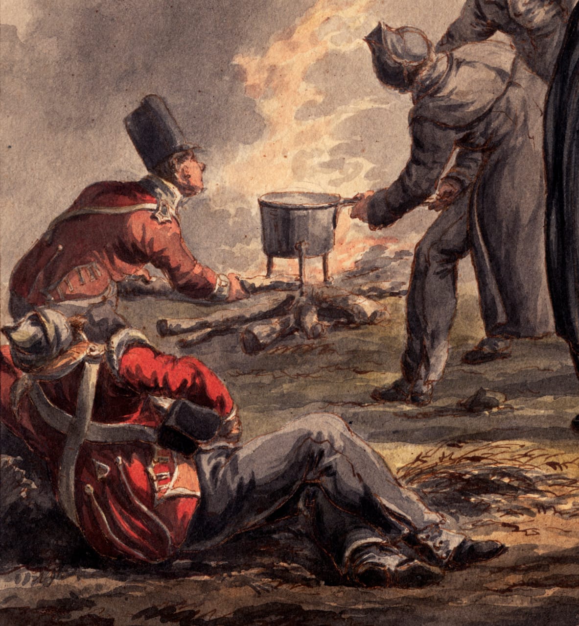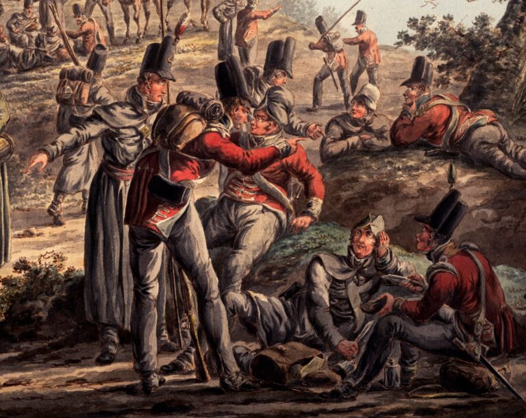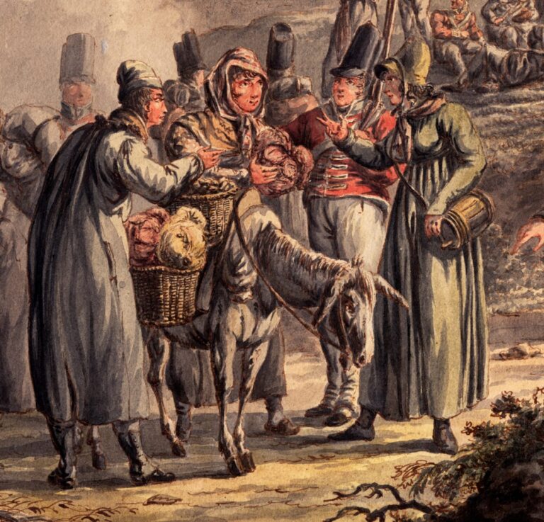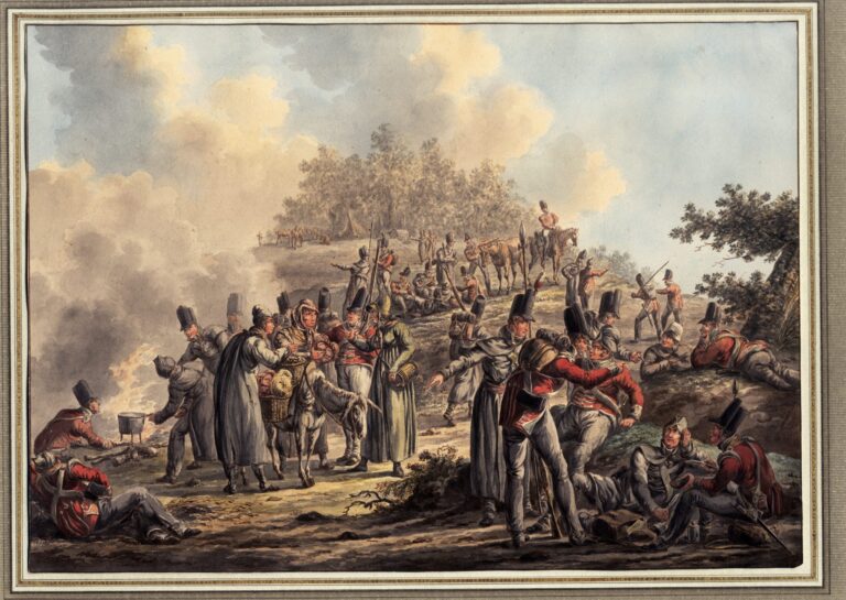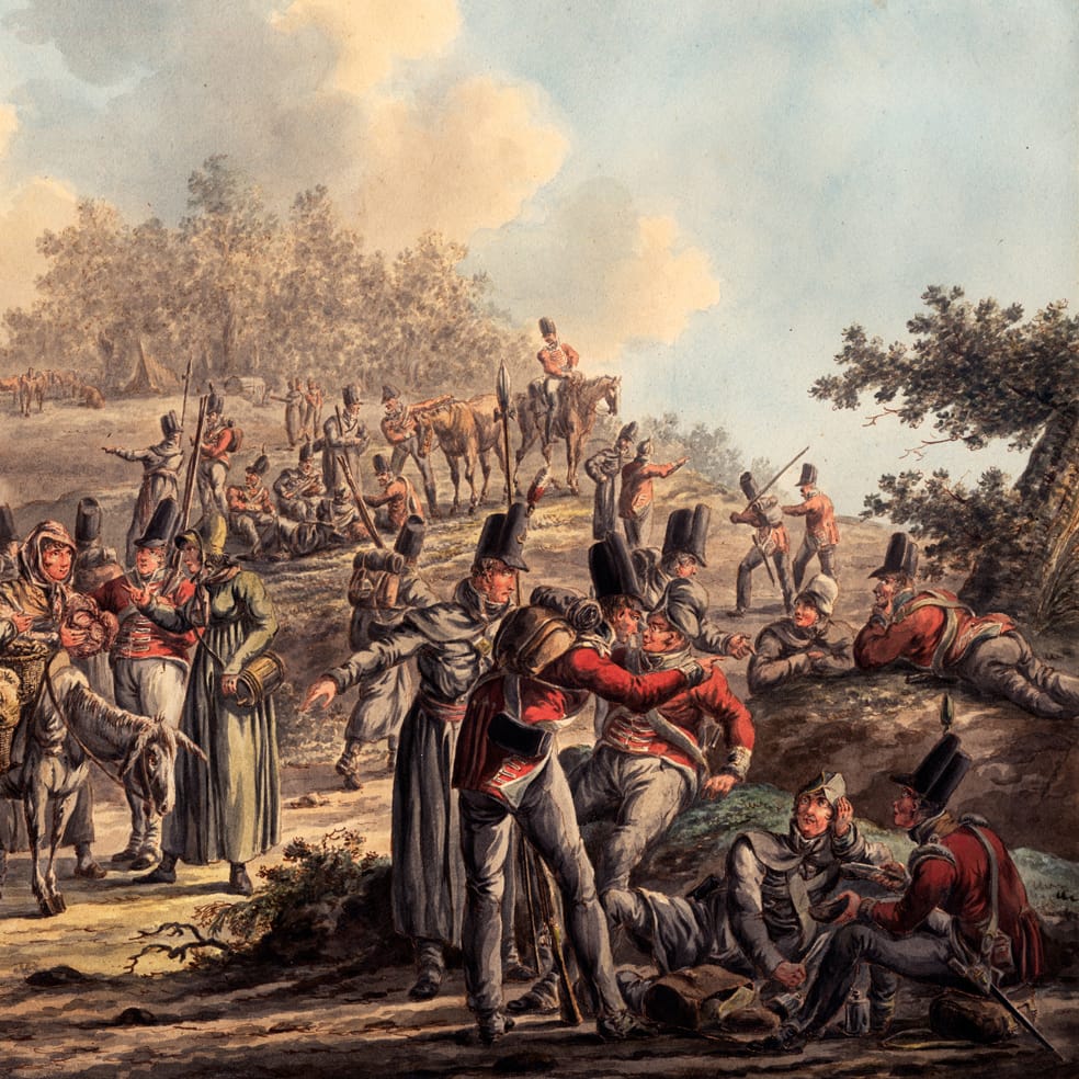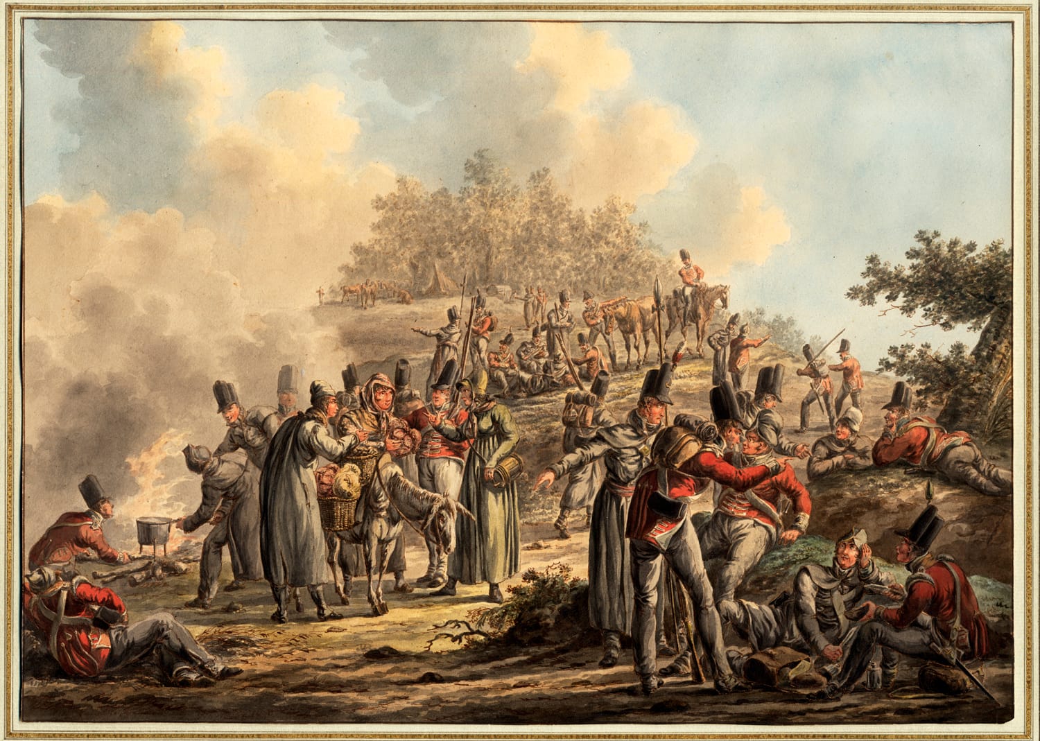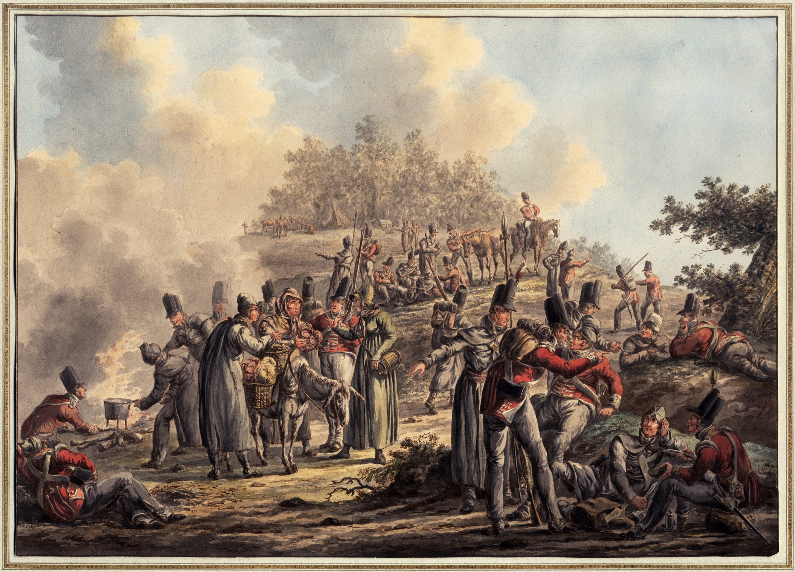 This superb watercolour shows British infantry soldiers, who fought on foot, making up camp for the night. The artist has shown soldiers sitting and lying down after a long day’s march, food being prepared, a pot heated over a campire, and soldiers purchasing vegetables from a travelling saleswoman on a donkey. Langendijk has depicted soldiers from at least two regiments, distinguished by the colours of their collars. Some soldiers are wearing grey overcoats to protect themselves from the drafty weather in modern-day Belgium. The gesticulating man in the grey overcoat behind the man wearing a small backpack with provisions in the foreground is identified as an officer by the ornament on his headwear, and the sash around his waist. The British infantry typically fought with pikes during this period, which are faithfully rendered in this watercolour. It has been suggested that Langendijk executed this scene around the time of the Battle of Waterloo in 1815, when British troops were in these regions.3>