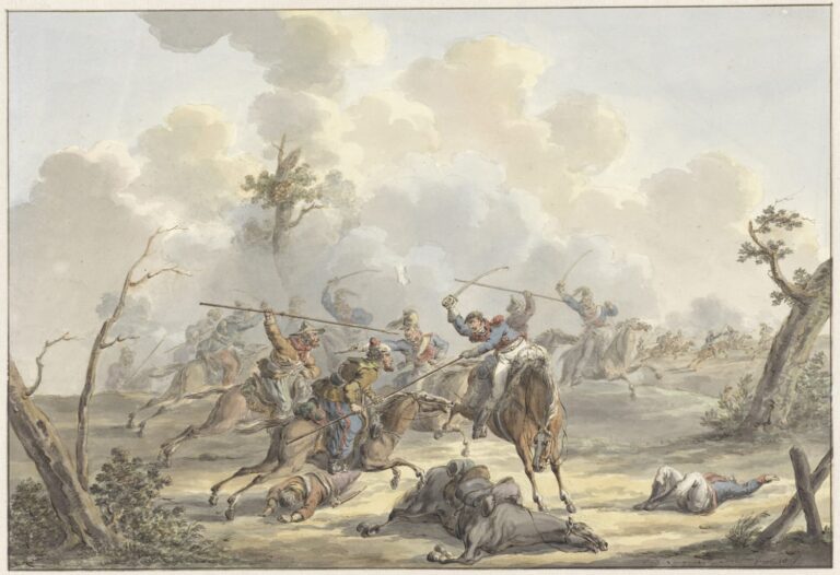 Jan Anthonie and Dirk are most famous for their work ad vivum, drawn ‘from the life’, of the French armies entering the Dutch Republic in 1794, and the resulting wars. Father and son followed the armies and the major battles, resulting in the Battle of Waterloo in 1815 during which Napoleon was defeated, and executed many very lively battle scenes. Jan Anthonie depicted many of the key historical events of his day, such as the entry of Louis Napoleon in Amsterdam on 20 April 1808 (Rijksmuseum, Amsterdam).