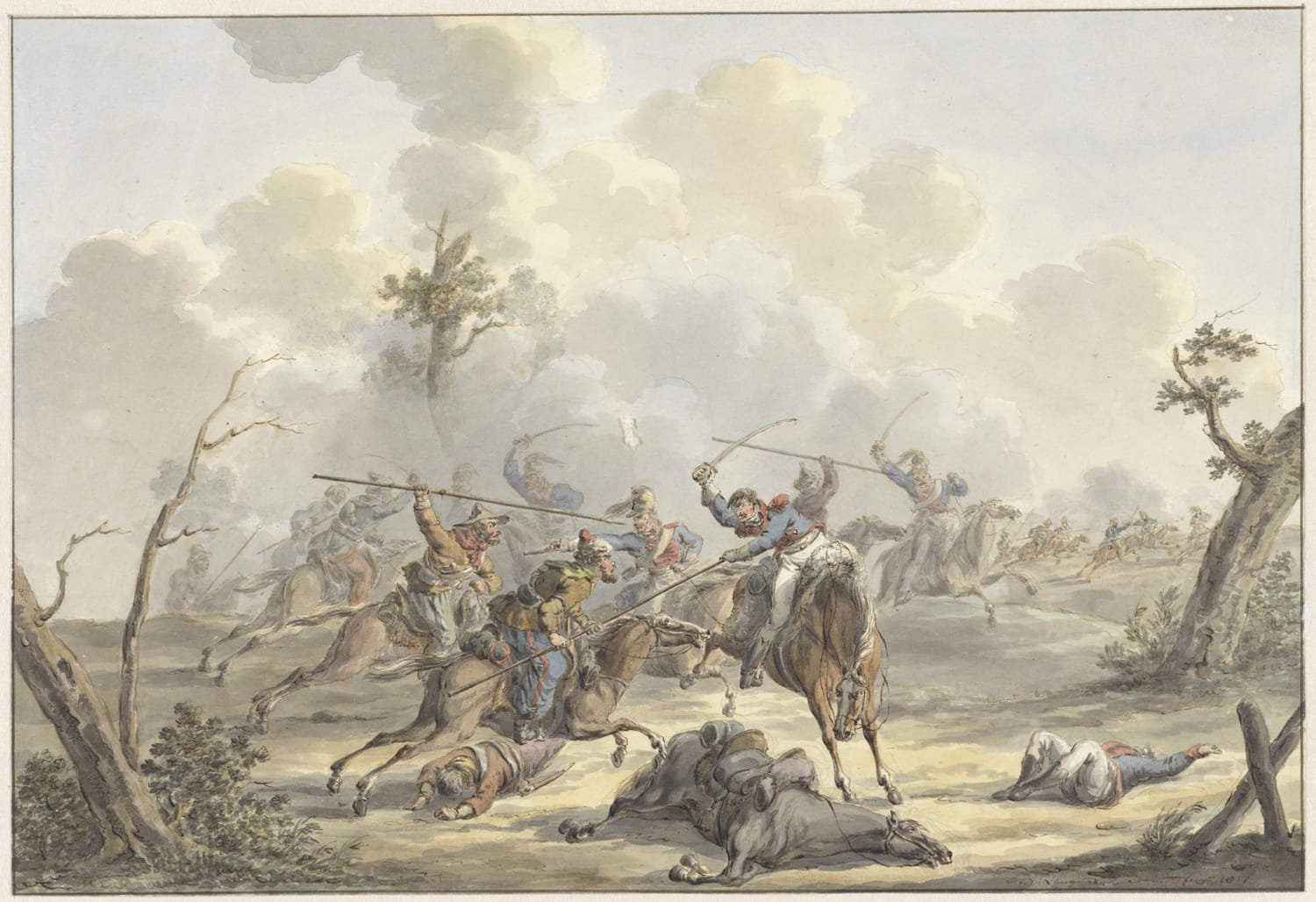 Our colourful and amusing drawing can be compared to Langendijk’s Cavalry Skirmish of 1817 in the Rijksmuseum, Amsterdam (see fig.).4 King George IV collected a large group of some five hundred drawings and watercolours by Dirk and Jan Antonie Langendijk, still preserved in the Royal Collection at Windsor Castle.5 Because his work was so favoured by contemporary collectors such as the English monarch, few of Jan Anthonie’s works are available on the market now.