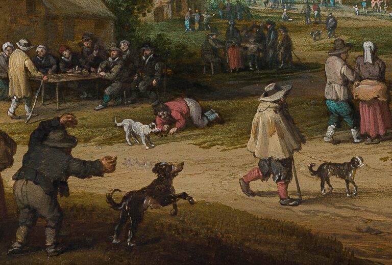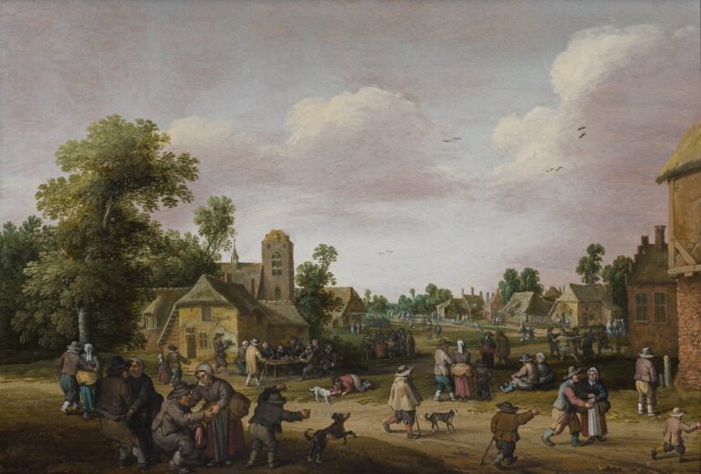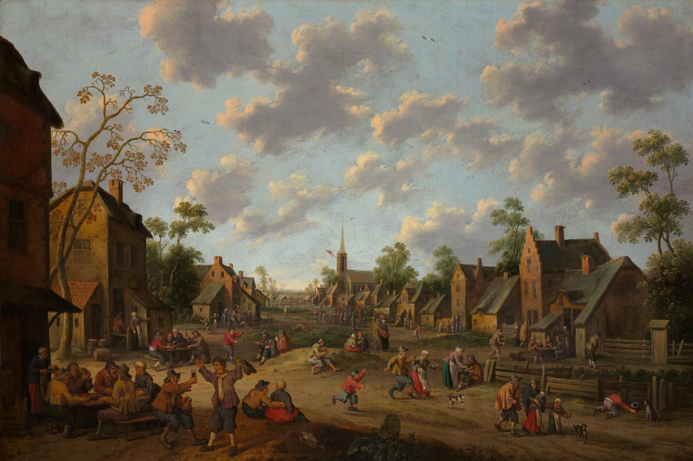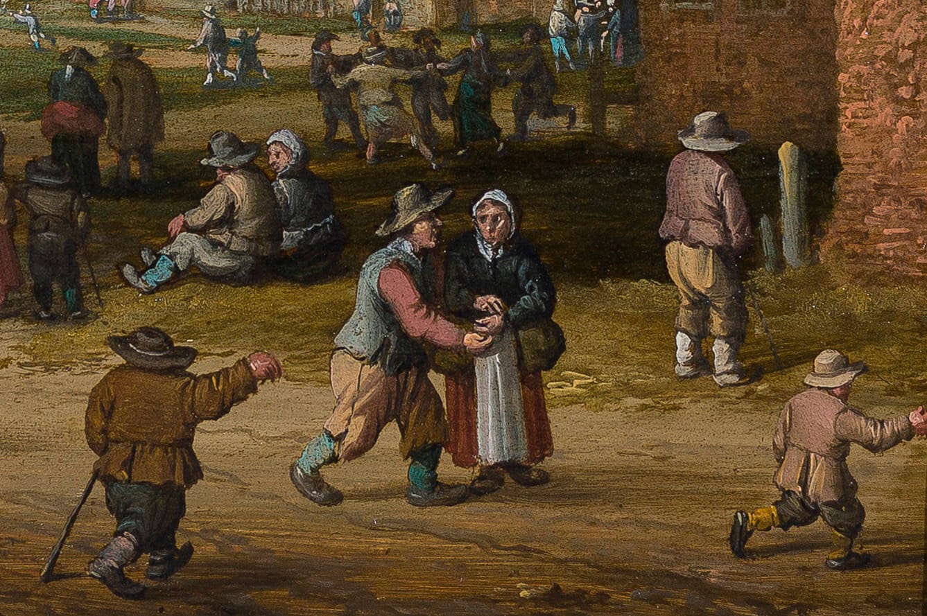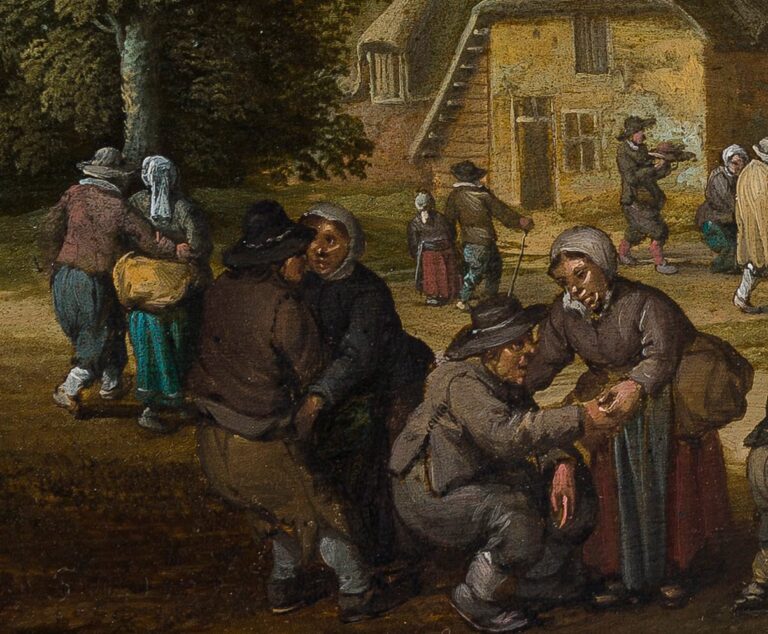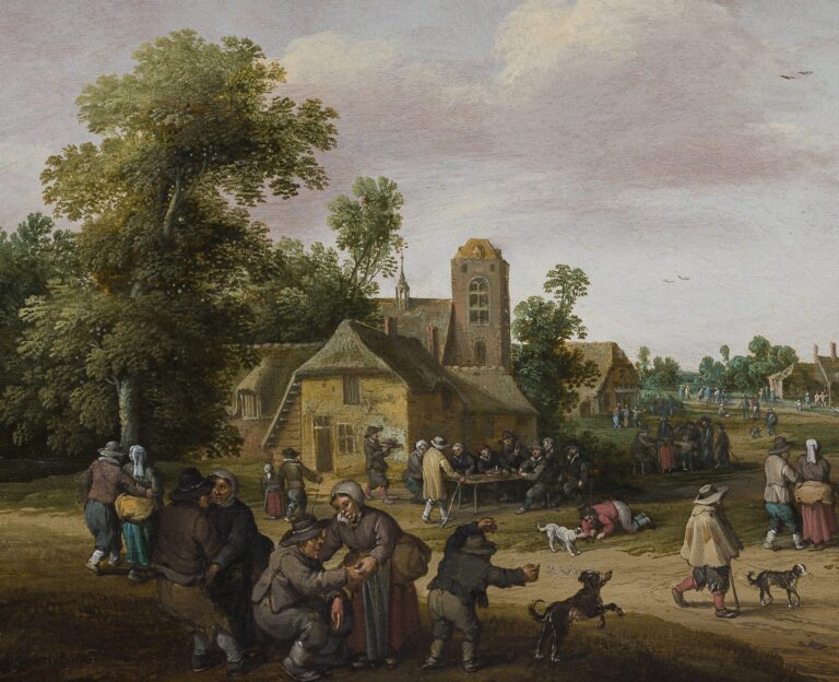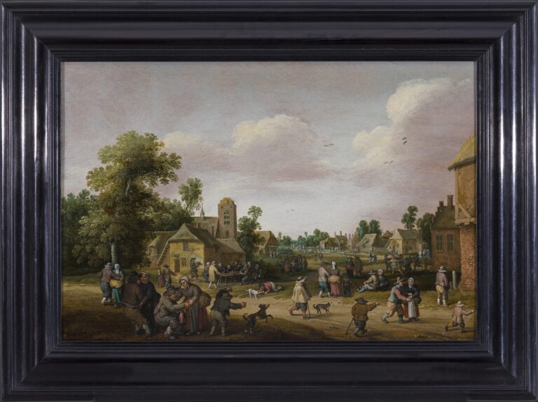 Droochsloot painted biblical and genre scenes, cavalry skirmishes and topographical views of Utrecht, Amersfoort and The Hague, but he is mostly known for his village fairs or ‘kermesses’, such as the present work, which is one of his most accomplished paintings. Like here, they are typically situated on an on open village square, lined by a church and a variety of thatched and gabled houses and farm buildings, populated by a large assembly of country folk engaged in merry activities. The figures in this intimate panel are particularly well observed and full of humour and character and it is easy to imagine how they would have appealed to picture collectors during the Golden Age, who were amused by depictions of ‘low life’ characters.