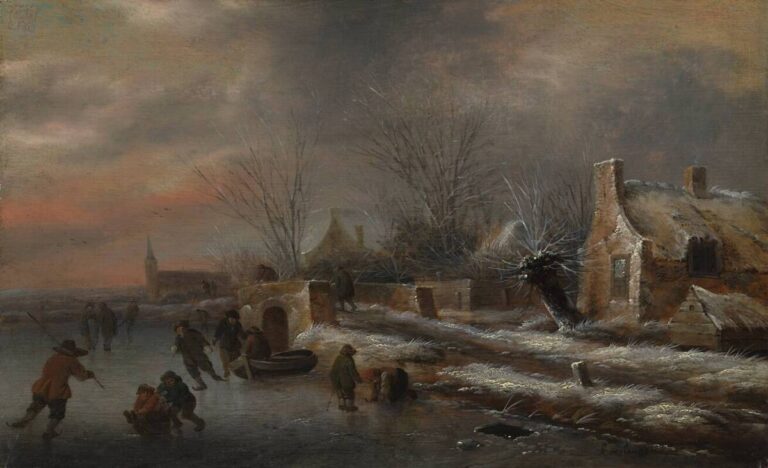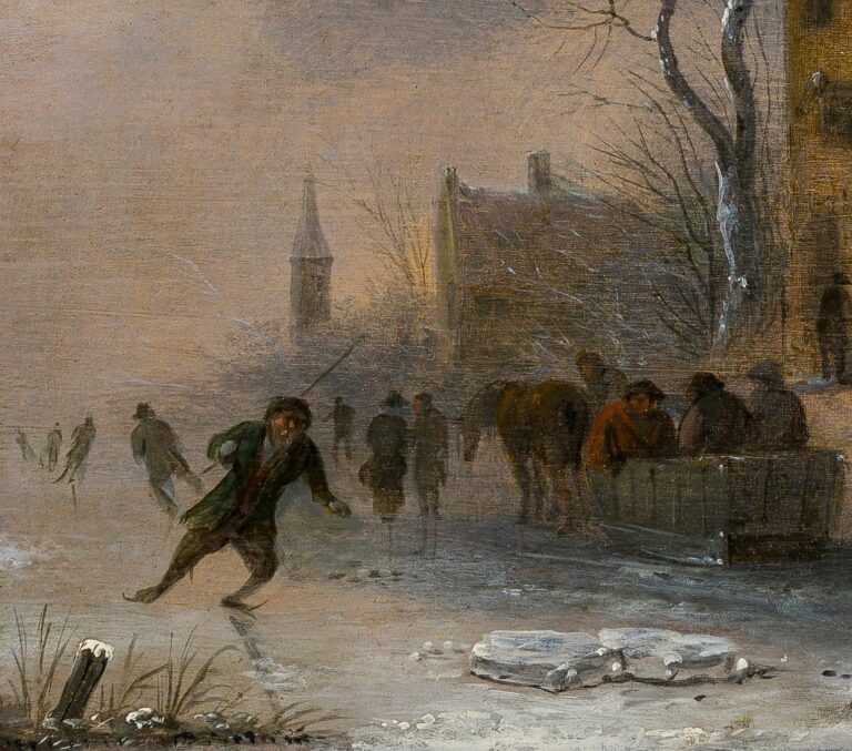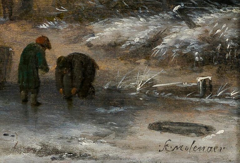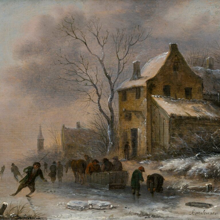 Our beautifully preserved work of particularly intimate size is a highlight in Molenaer’s extensive oeuvre. It can for instance be compared to a Winter Landscape in the Kröller Müller Museum in Otterlo (fig.).2 Winter landscapes are among Molenaer’s most beloved works. Winters were harsh during the seventeenth century, which is known as the Small Ice Age, and the genre of the winter landscape flourished.
