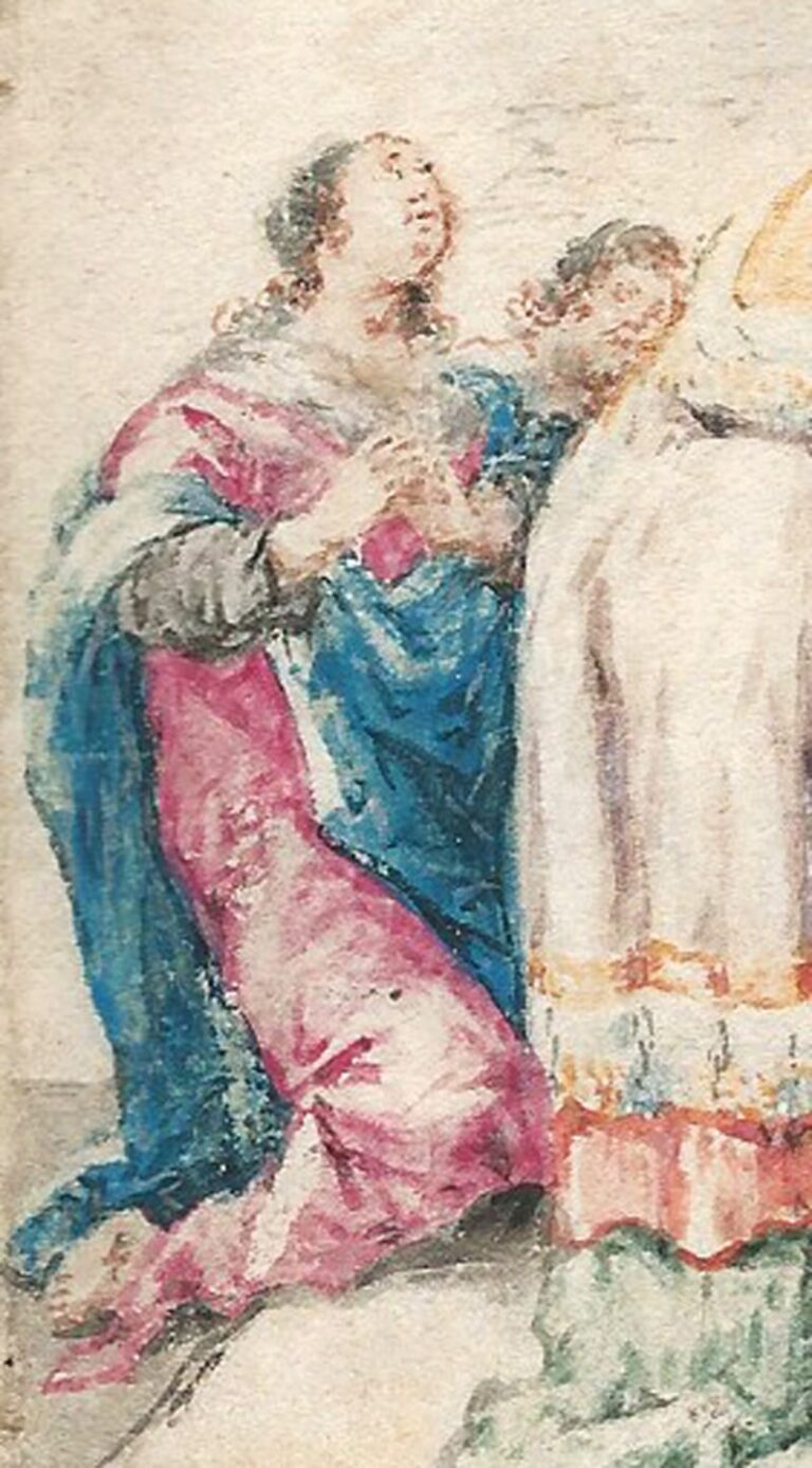 Brush and grey ink and watercolour on vellum, 118 x 93 mm (4.6 x 3.7 inch); hinged onto an 18th- or 19th-century collector’s mount with framing lines in pen and brown ink