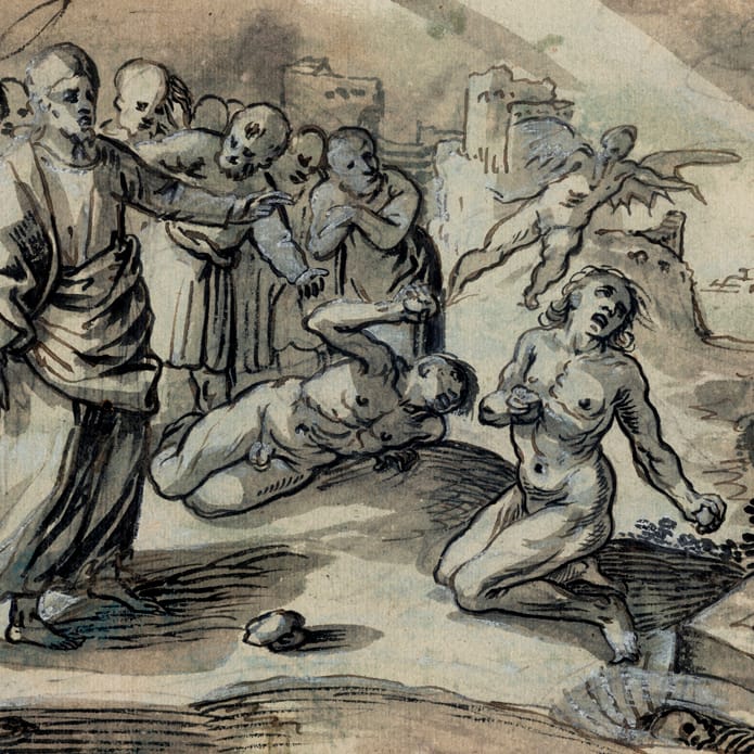Jesus’s healing of the crippled man beside the pool called Bethesda is one of nine healing miracles involving water and one of seven performed on the Sabbath. Only the apostle John records it (John 5:1-16). The sick and infirm gathered near the pool – Bethesda in Aramaic – believing the water to possess healing properties. The artist has chosen the dramatic moment where Christ orders the crippled man to walk, dramatically rising in the centre of the composition.
