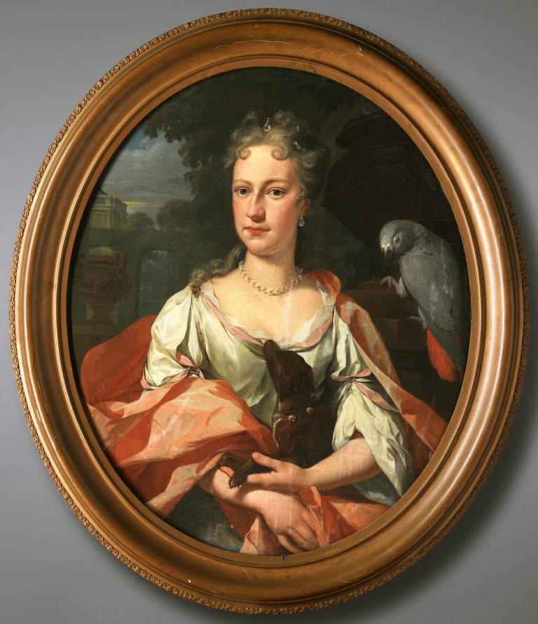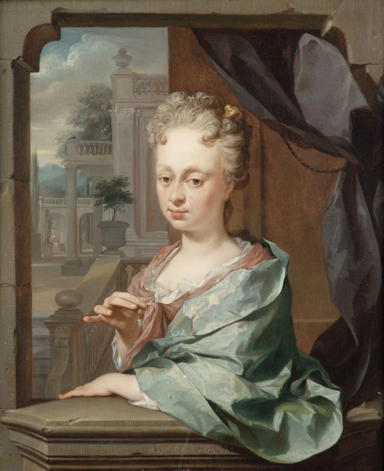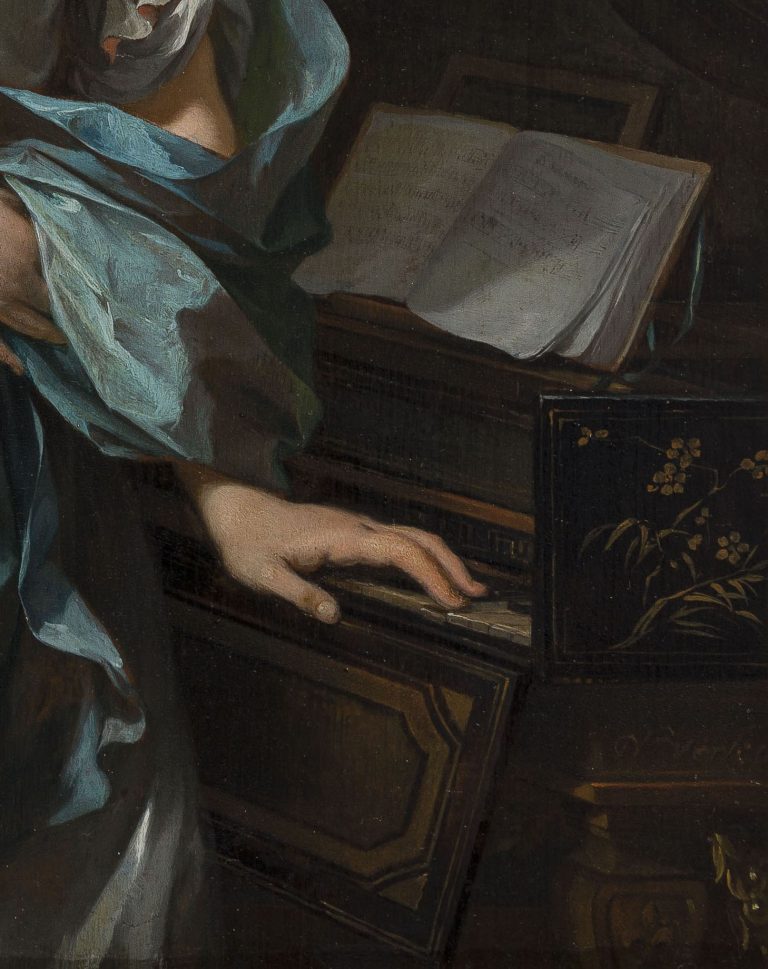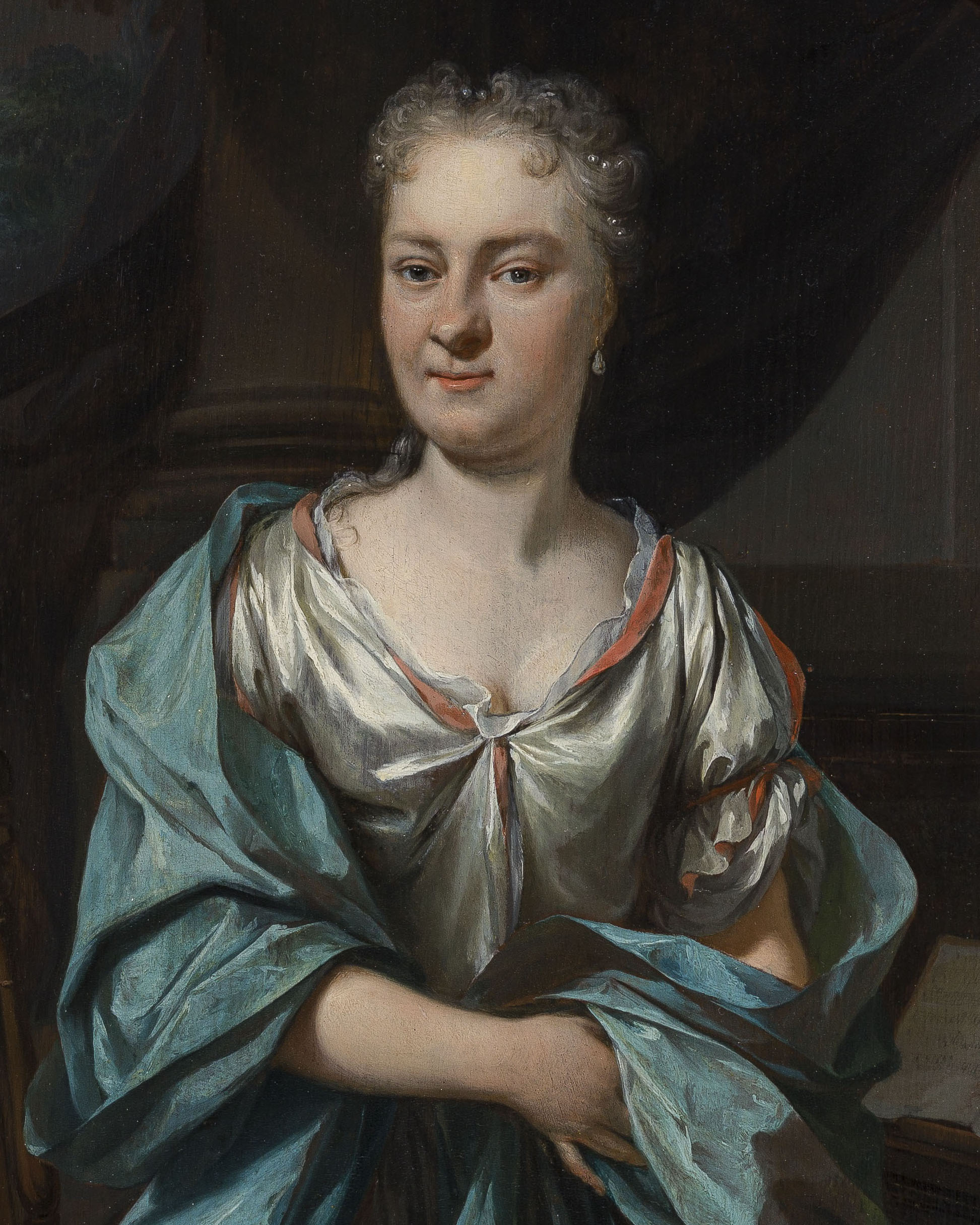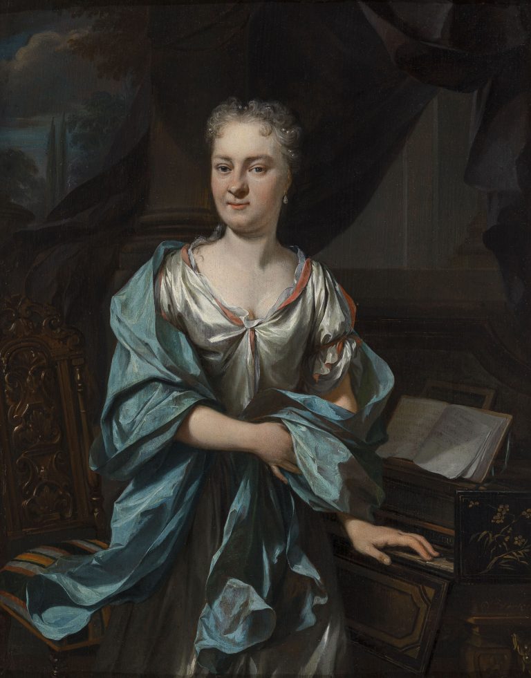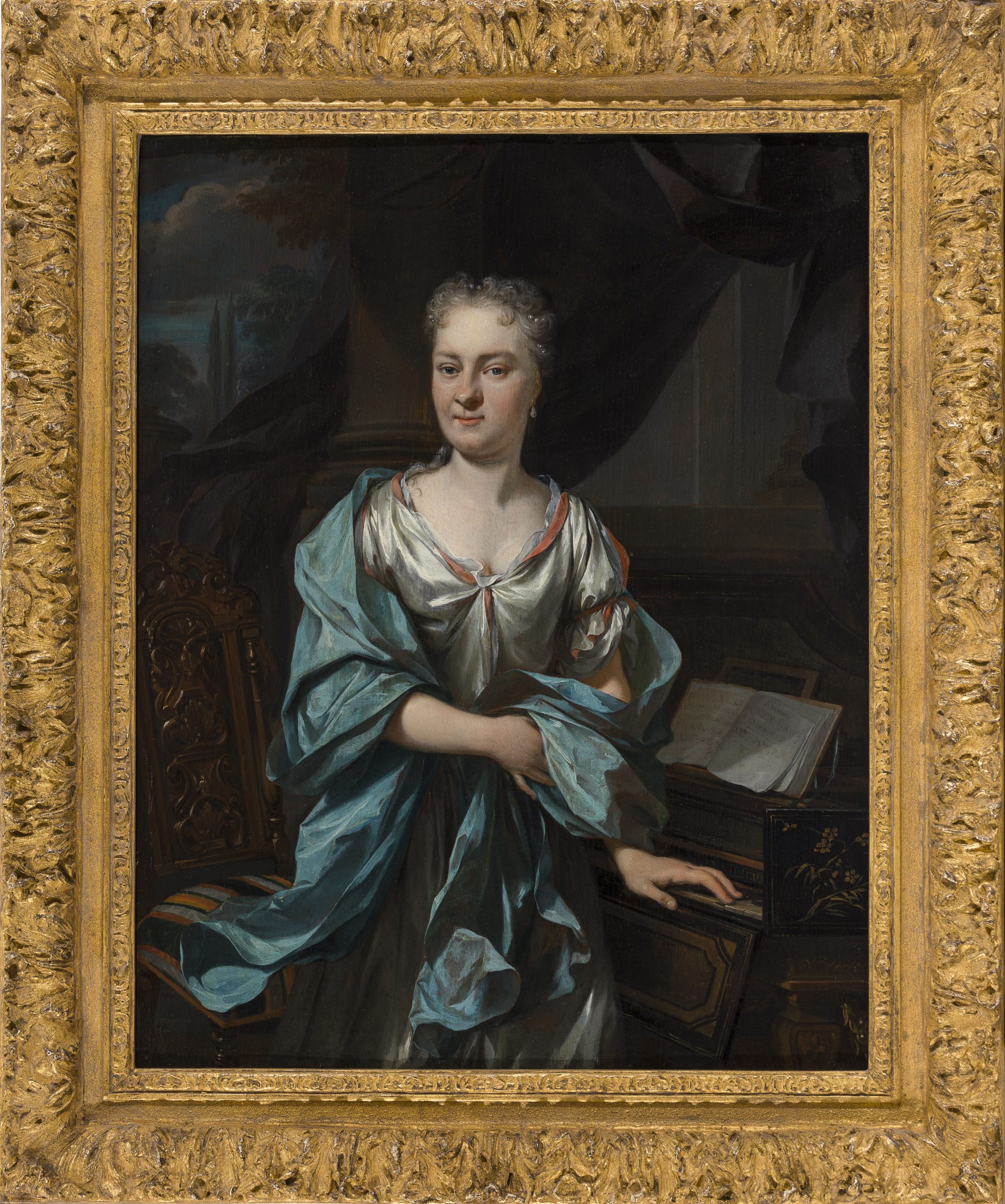 This portrait shows a lady standing at a harpsichord, decorated with fashionable Chinoiserie black-lacquer, while the elaborately carved chair beside her is a fascinating example of Anglo-Dutch Baroque furniture-making – the striped blue, white and orange fabric of its seat is an interesting record of how such chairs were originally upholstered. Although the instrument and the chair could be accurate portrayal of the lady’s cherished possessions, the columned architectural background and southern landscape beyond are certainly imaginary, frequently employed by Verkolje for his fashionable portraits.