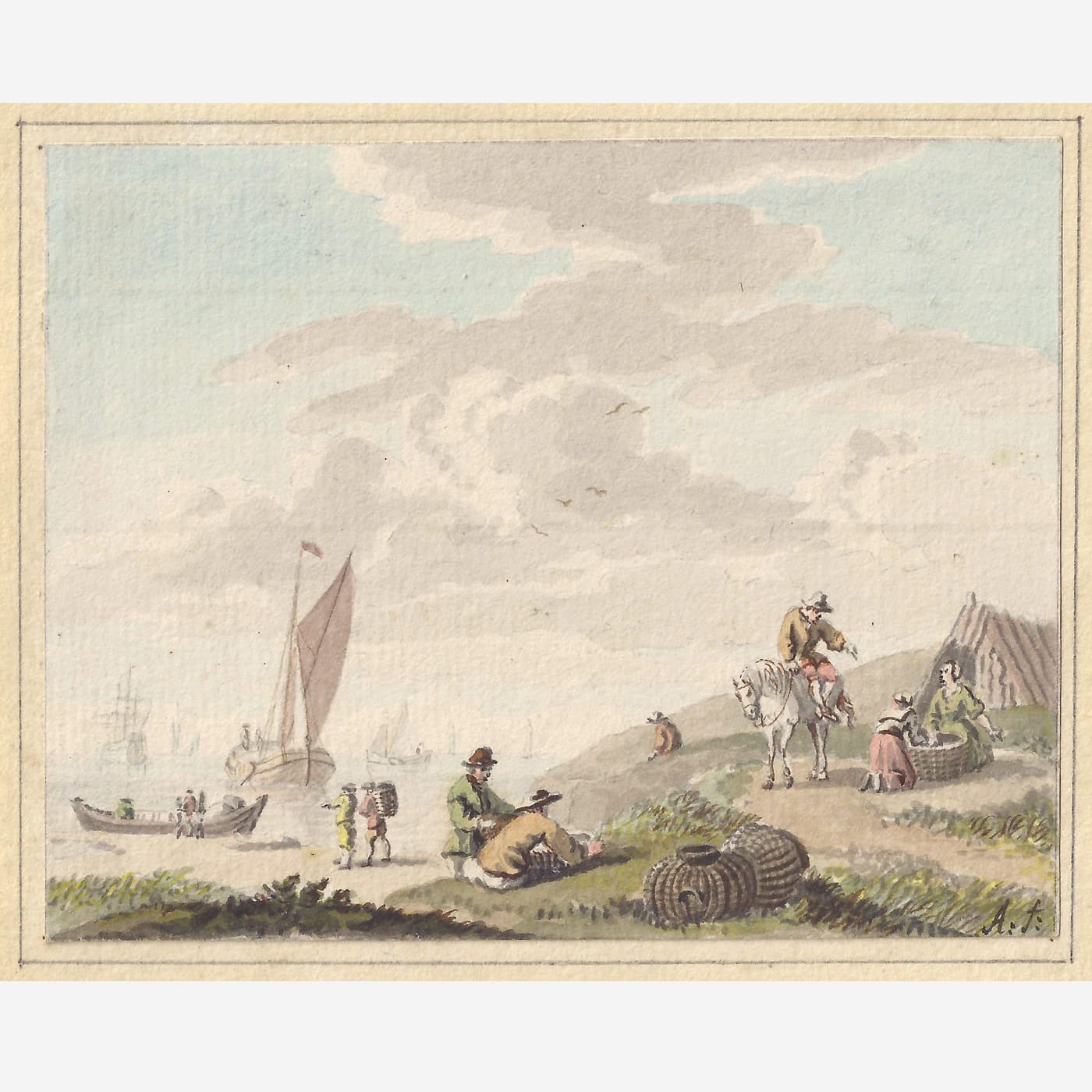 The present pair of charming and beautifully preserved watercolours interestingly depict a typical Southern and a Northern view: an Italianate landscape with Classical architecture and a background of distant hills in the first, and a Northern coastal view as can be seen along the shores of Holland. A comparable pair of two coastal views by Aartman, of somewhat smaller dimensions, is preserved in the Metropolitan Museum, New York (fig.).3