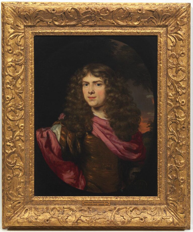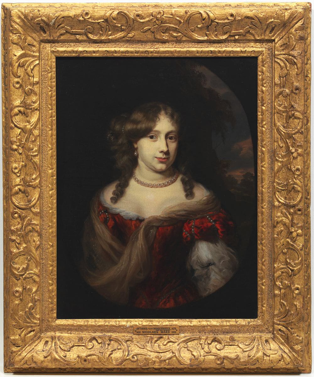 Joost van Hoogenhouck married Anthonia des Quiens of Leiden on 11 January 1667. He was a Knight of the Holy Roman Empire and served as Councillor, Alderman, and Burgomaster of the city of Leiden, and was a Governor of the West India Company of Amsterdam. It is comparatively rare for pendant portraits by Maes to have remained together, and even less usual that the identities of their sitters have been preserved. This pair can for instance be compared to the portraits of Admiral Jacob Binkes and his bethrothed Ingena Rotterdam in the Metropolitan Museum in New York, which are identical in size and were also painted in 1676 (fig.).2