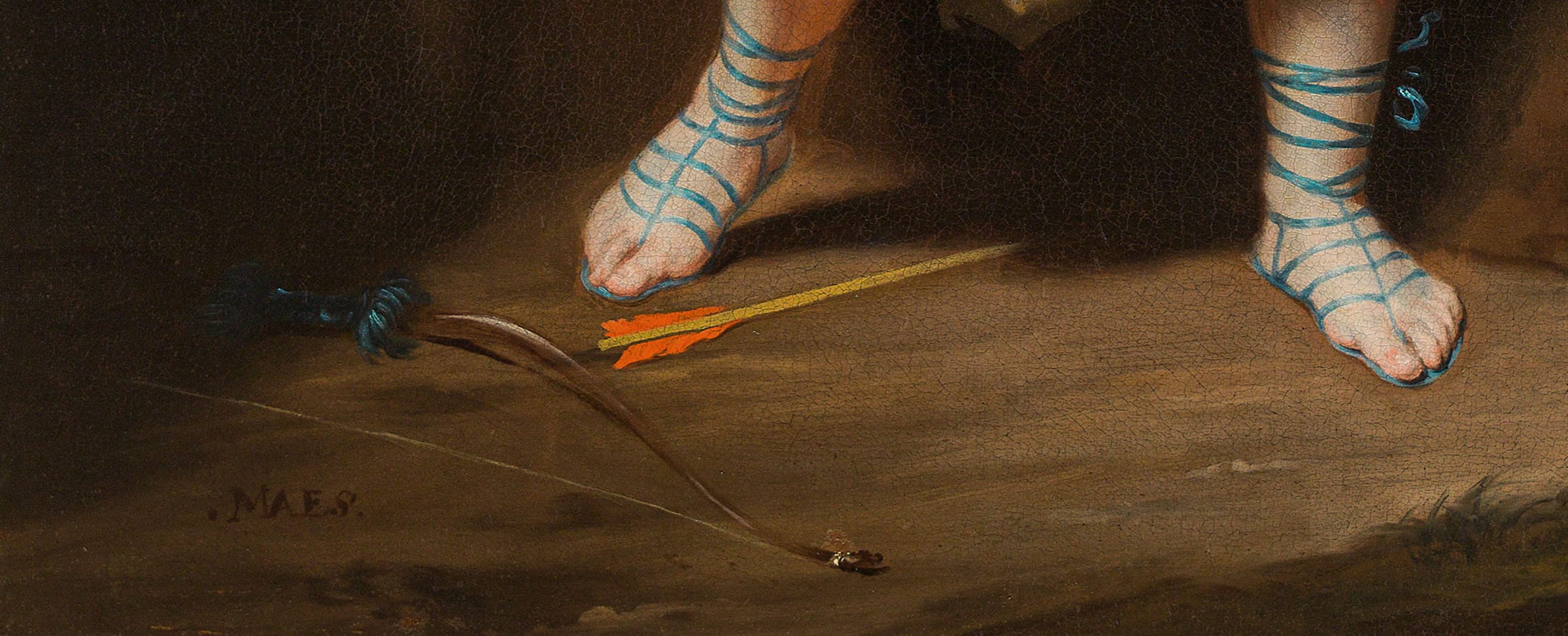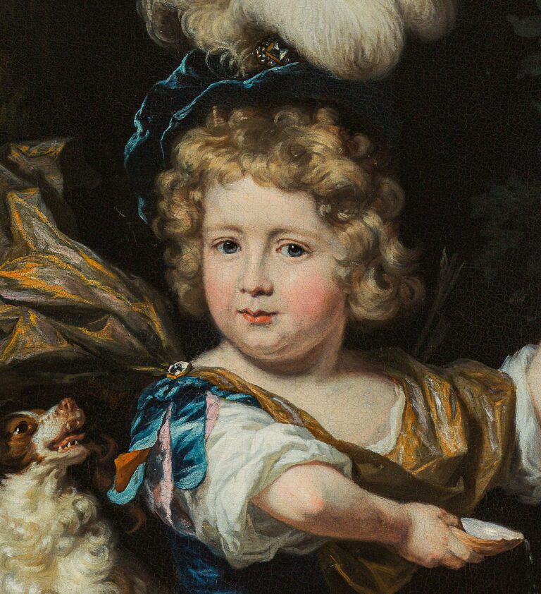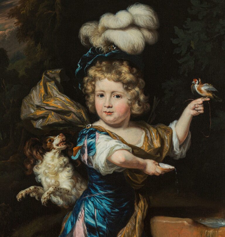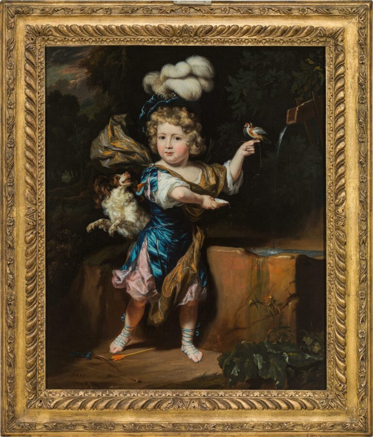 The present portrait of a young boy, whose identity has sadly been lost over time, was painted circa 1675-1680, when Maes was settled in Amsterdam. The boy is dressed in a fantasy costume, loosely based on examples from Roman Antiquity. The bow and arrow at his feet and the goldfinch on a string on his finger identify him as a representation as Cupid, son of Venus. The fountain and shell refer to the popular play Granida and Daifilo by Pieter Cornelisz Hooft. It was customary for sitters during the Golden Age to be depicted as characters from Classical mythology, the Bible or even as shepherds and shepherdesses. Maes also depicted young boys as Ganymedes and the hunter Adonis. A comparable portrait by Maes of four children in mythological guises is preserved in the Dordrechts Museum, Dordrecht (fig.).3 Another comparable portrait of a boy with a bullfinch is in the Minneapolis Institute of Art (fig.).4