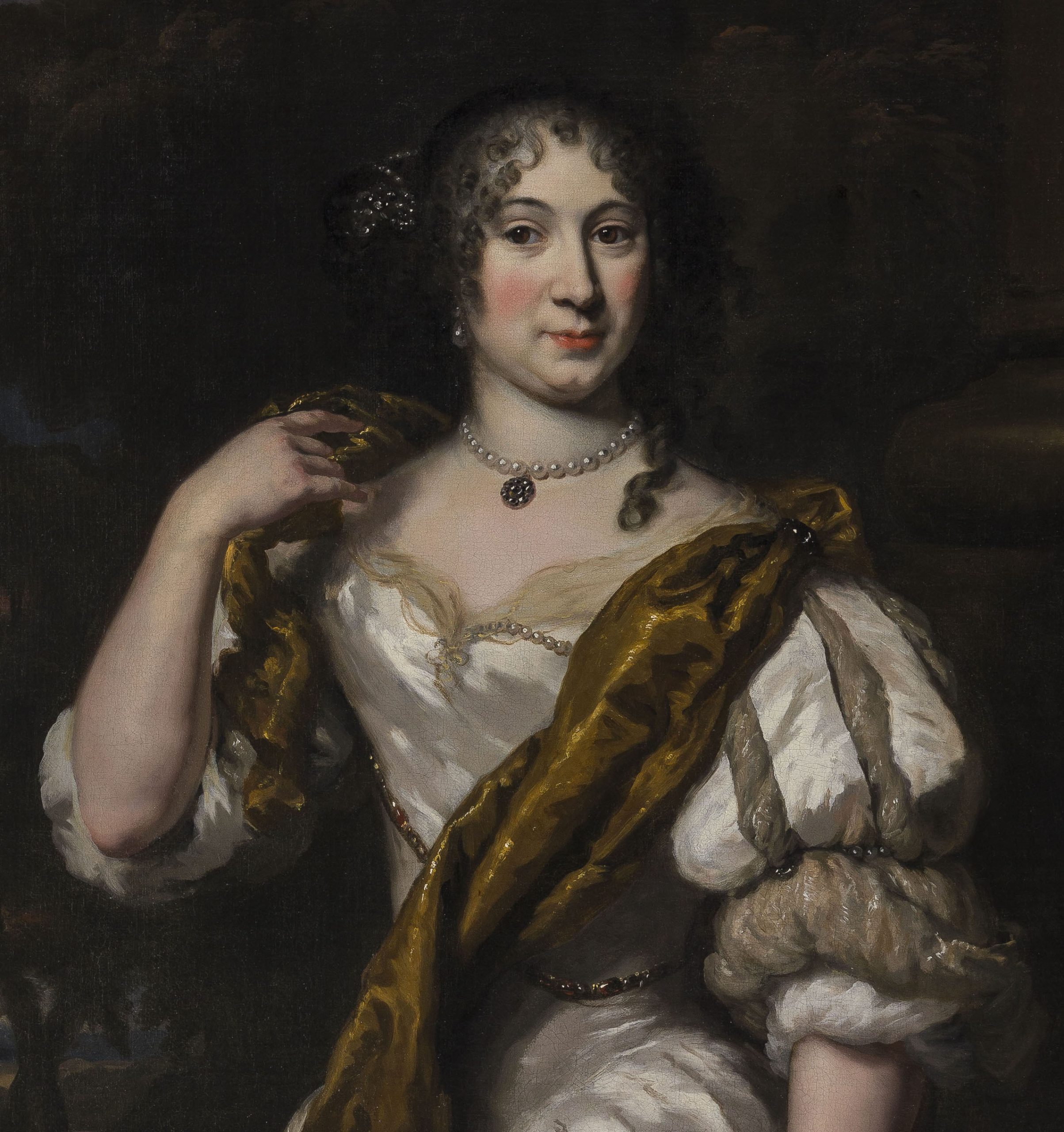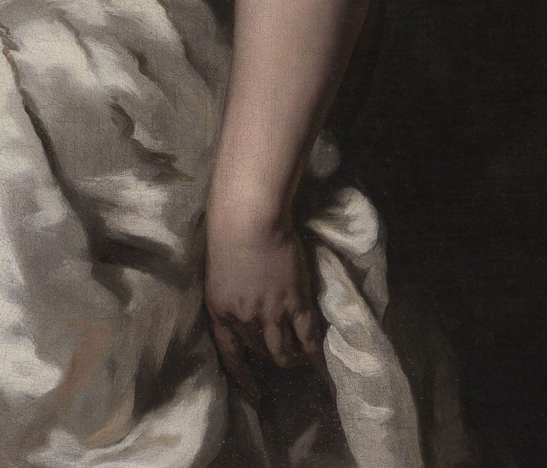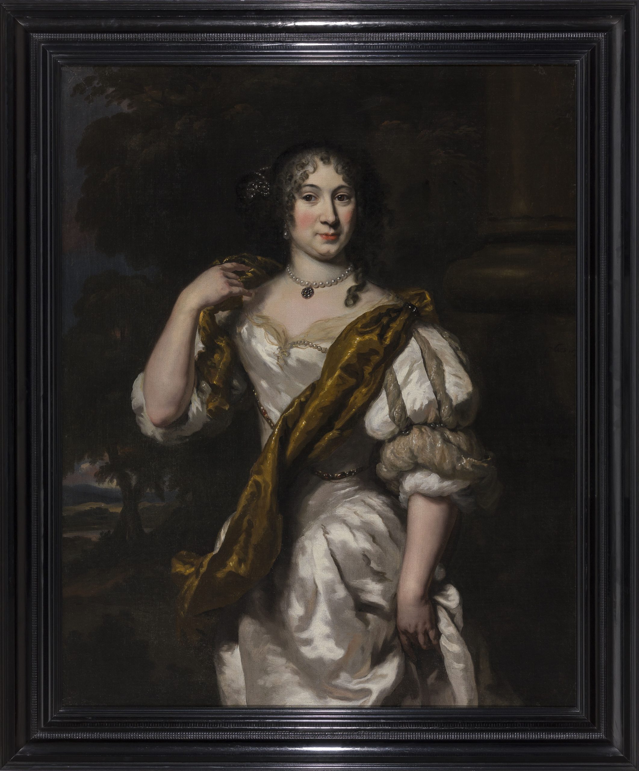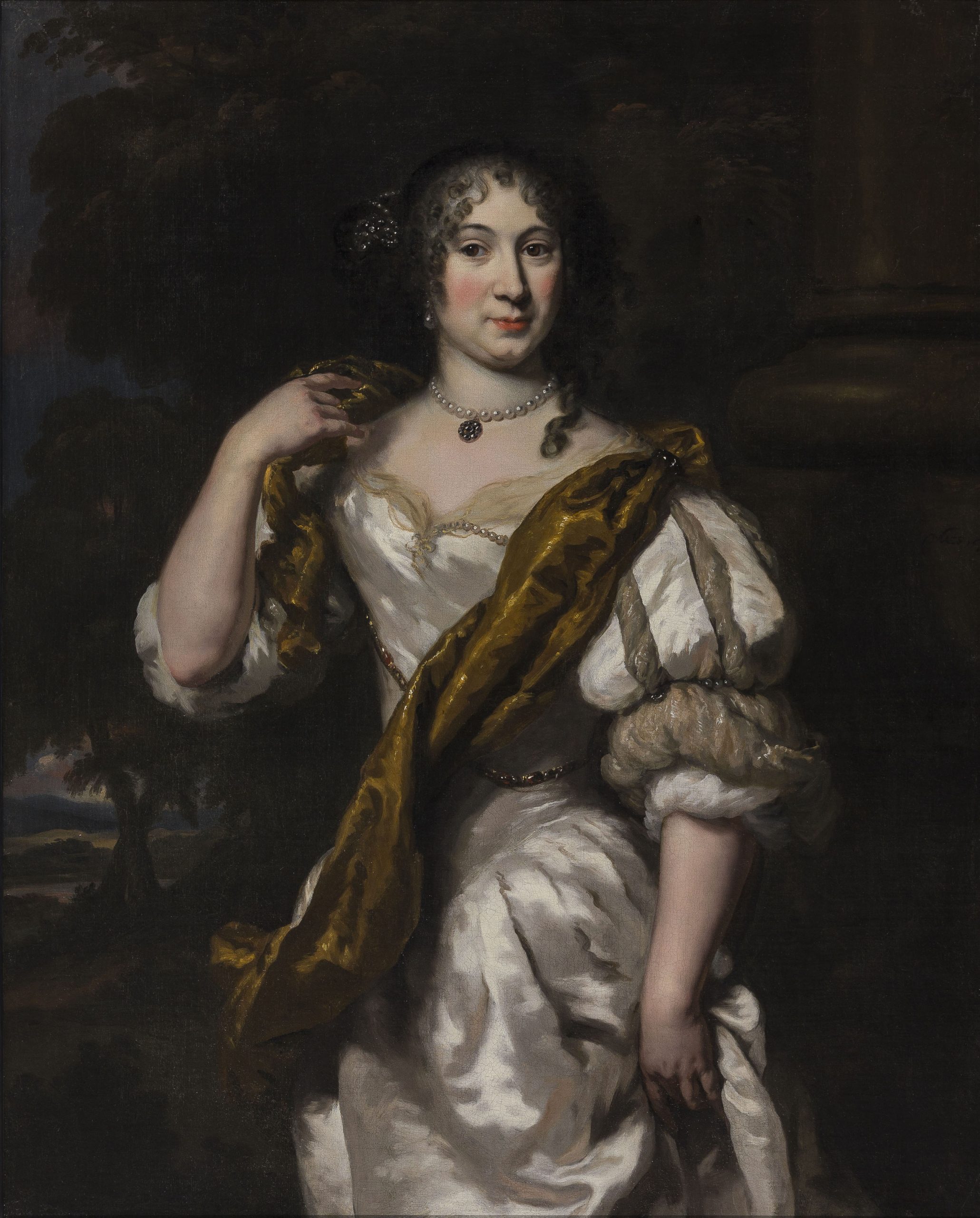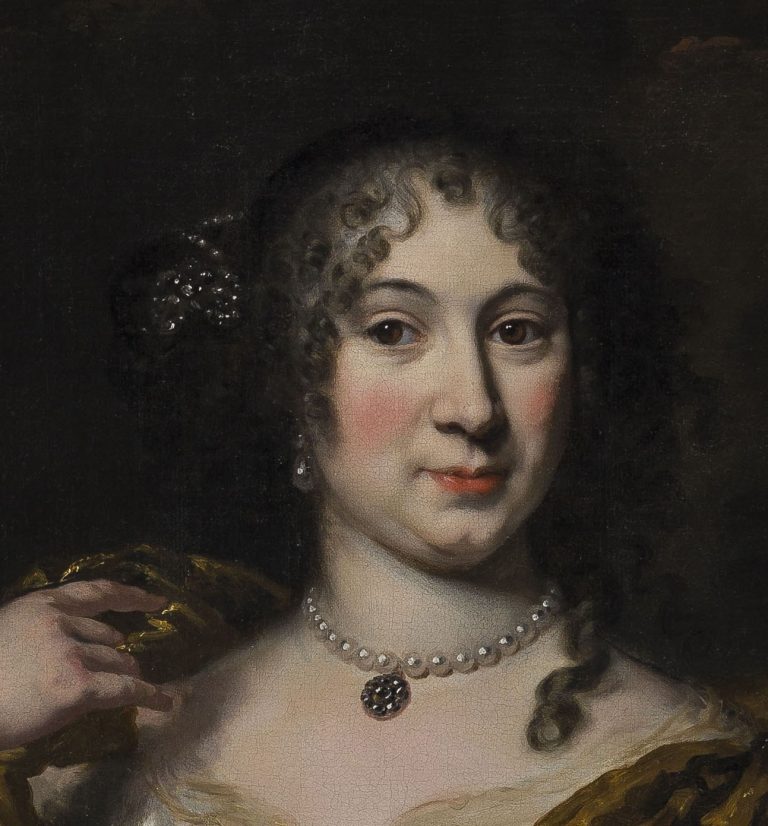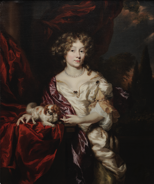 ~ Sold by James Lowther, 7th Earl of Lonsdale (1922–2006) at Christie’s, London, 24 April 1970, lot 126 (‘Maes. Portrait of a lady, three-quarter length, wearing a white satin dress with a gold sash, and jewels in her hair’)