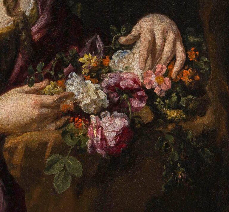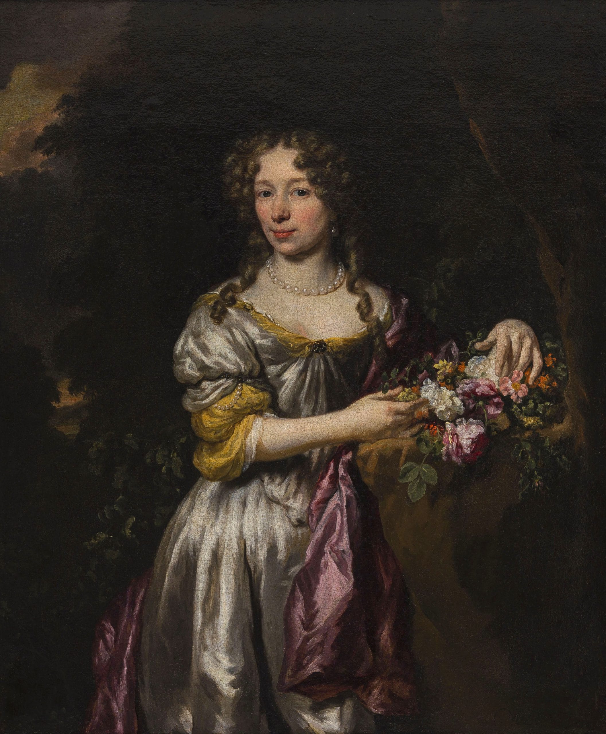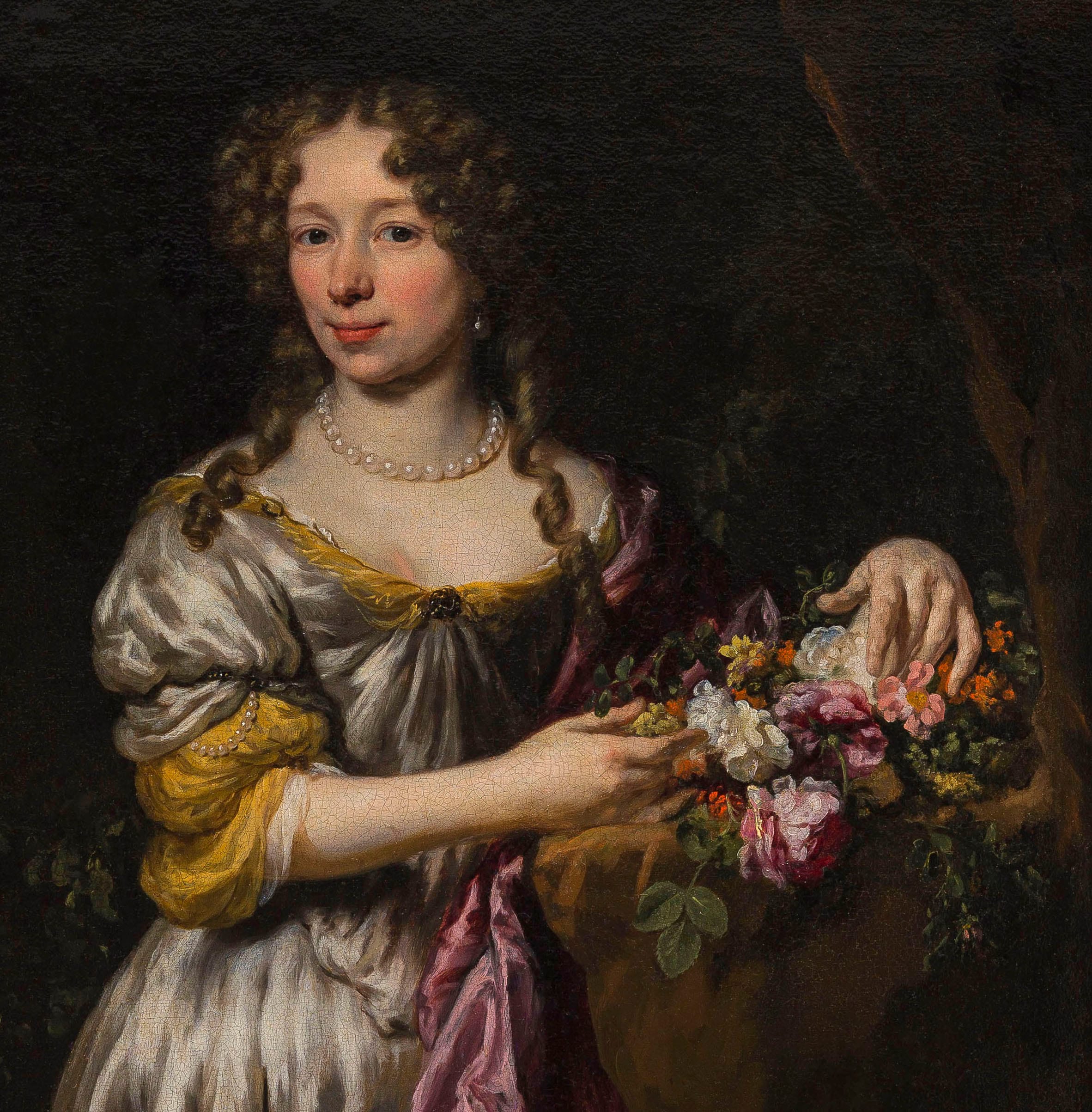 The present pair of paintings have remained together since they were first created, but sadly the identity of their subjects has been lost to time, as is often the case. They were painted circa 1675-1680, when Maes was settled in Amsterdam, and are larger than the format that the artist frequently used for his portraits during this period, attesting to the prosperity of the sitters. The gentleman, standing in an Italianate evening landscape, leans casually on a Classical relief, suggesting a life of travel and erudition. Of handsome features, he wears an ochre-coloured ‘Japonsche rock’, generally worn indoors. Maes has painted its folds with his usual ease and spontaneity, while the long flowing hair is also masterly handled. The female counterpart is of a particularly young and attractive woman, wearing a dress of white and yellow silk and a scarlet shawl. Like her husband, she is also standing in an Italianate landscape and holds a bouquet of flowers, another highly attractive detail, beautifully painted by Maes. She illustrates clearly the remark by Houbraken that the elegant ladies of Amsterdam preferred white to brown.
