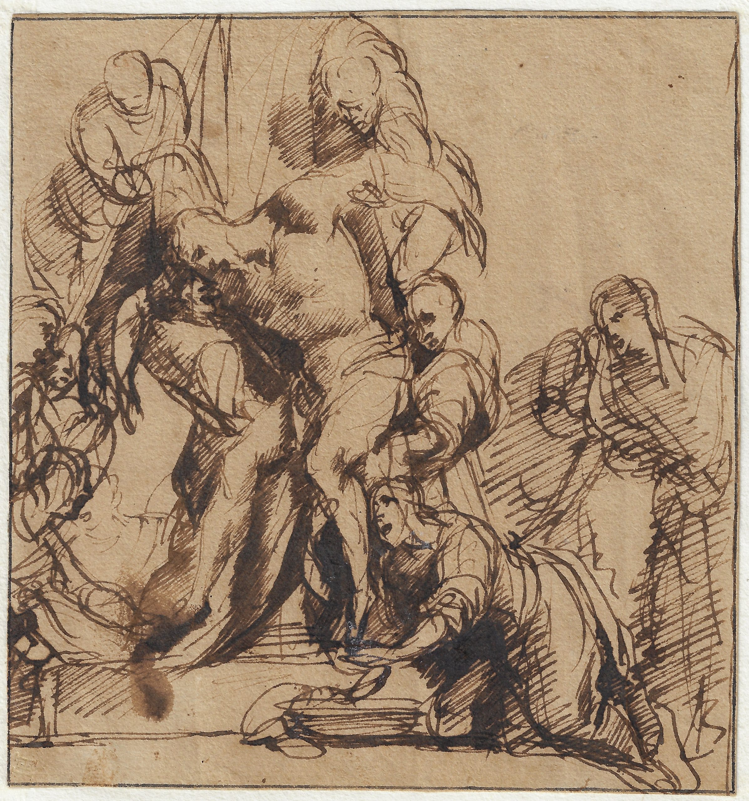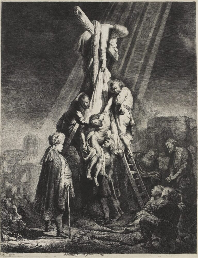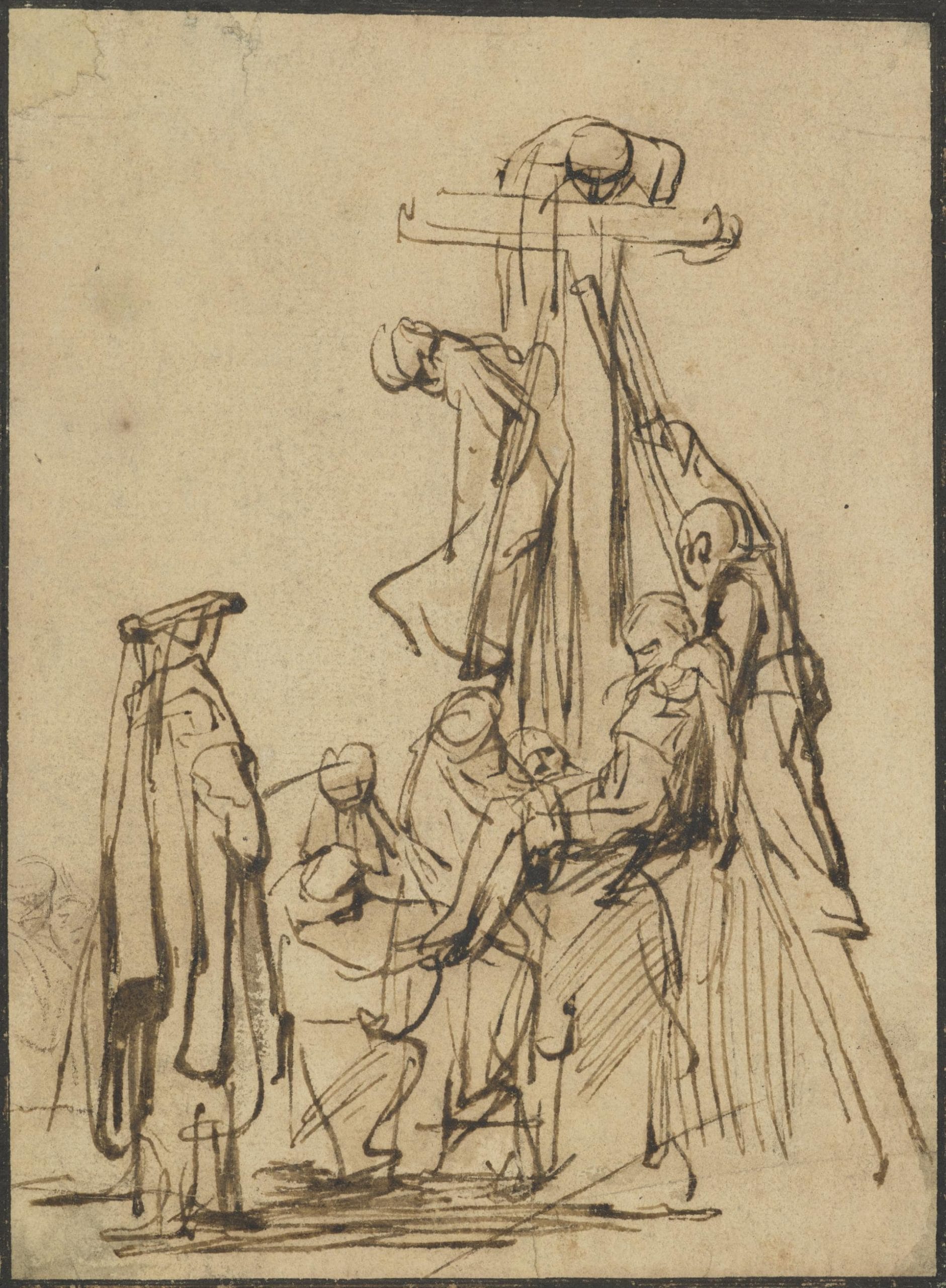 Rembrandt himself explored the highly emotionally charged theme of the Descent from the Cross in various works during the course of his career, both in paintings, drawings and etchings. The author of the present drawing would certainly have been influenced by Rembrandt’s etching of the same subject of 1633, which shows a particularly contorted body of Christ (fig.).3