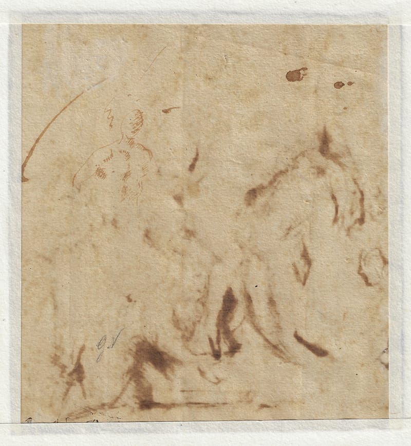 The quick study of a male torso on the verso and the careless splash of ink indicate the drawing was kept in the artist’s studio and used as part of working processes, rather than for sale, as was standard practise with Rembrandt and his entourage, who were active draughtsmen.