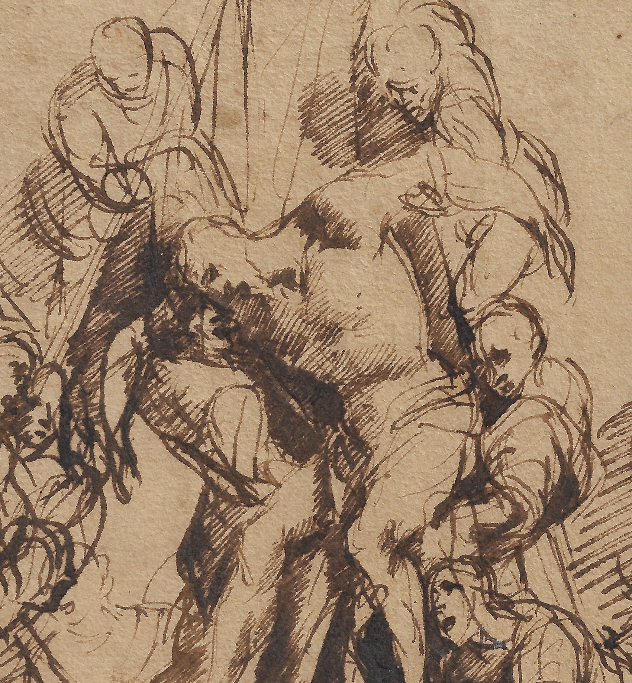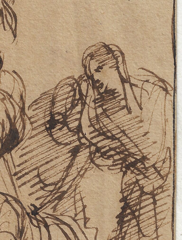Because of the number of students, the rarity of signed sheets and the dependence on Rembrandt’s own technique, it is sometimes difficult to securely attribute drawings produced in Rembrandt’s orbit – as is also the case here. Stylistically, the drawing can be dated to c.1640-1650. Although it has been executed with considerable vigour and confidence, indicating a strong artistic personality, the identity of the artist has so far remained elusive. Students in Rembrandt’s studio in this period included for instance Ferdinand Bol (1616–1680) and Gerbrand van den Eeckhout (1621–1674). Some of the latter’s drawings are executed in a similar technique with prominent and swiftly applied zig-zag lines, such as Nathan Admonishing David in the Louvre (fig.).1 Van den Eeckhout treated the theme of the Descent from the Cross in a drawing preserved in the National Galleries of Scotland, Edinburgh (fig.).2