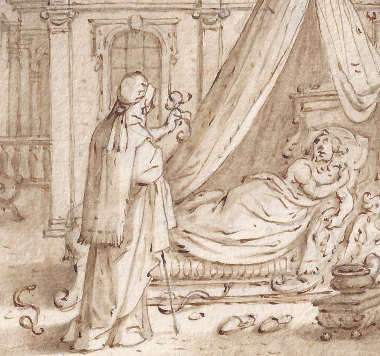 The present sheet illustrates a scene from book VII, lines 413 ff., in which Alecto, one of the snake-haired Furies, appears to Turnus, King of the Rutulians, a tribe in Latium. Alecta appears in the guise of an old woman named Calybe, priestess of the temple of Juno, inflames the King against Aeneas and the Trojans, which resulted in warfare between the Trojans and the Rutulians. The Fury is accompanied by several snakes, crawling over the startled King’s bedroom floor.