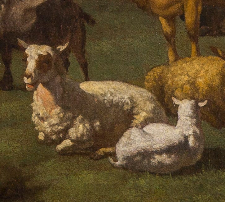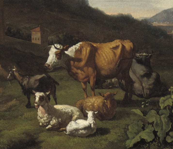 An Italianate Landscape with Cows, sheep and a goat in a meadow, a peasant woman milking a cow in the background