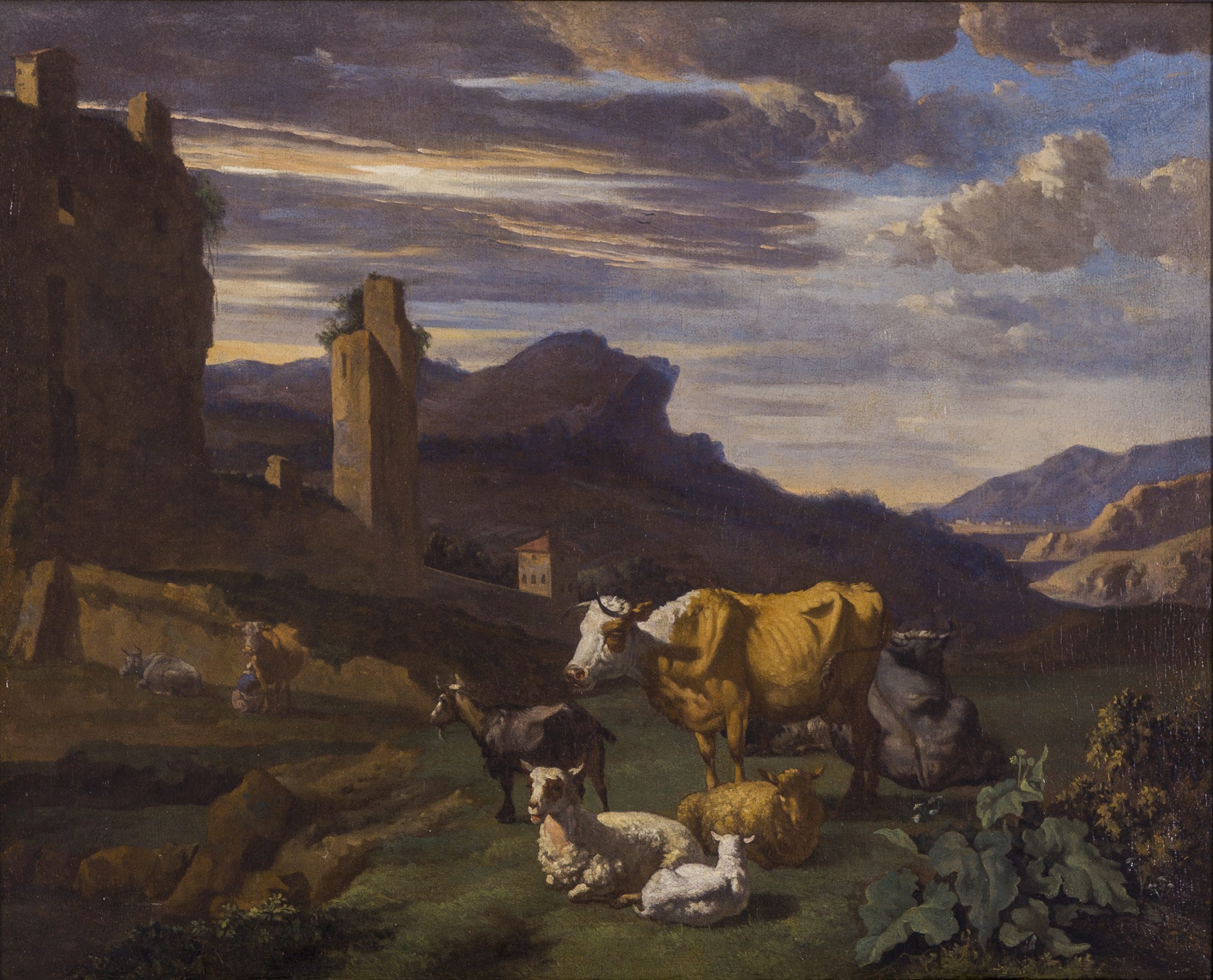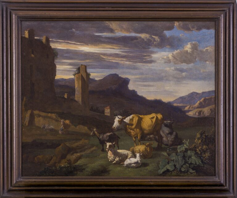 Romeyn remained in Haarlem for the rest of his life, drawing on the impressions he had gathered during his sojourn in Rome, and drawings ‘naer ’t leven’ (from life), which he made there, as he was also an active and talented draughtsman. His paintings display the influence of his master Berchem, and are invariably infused by a warm Mediterranean light. Romeyn excelled at charming representations of farm animals, such as the cattle and goats shown in the present work. Italianate landscapes were highly valued during the seventeenth century by collectors from the highest layers of society, who had frequently visited Italy themselves and were generally well schooled in the authors of Classical Antiquity.