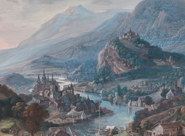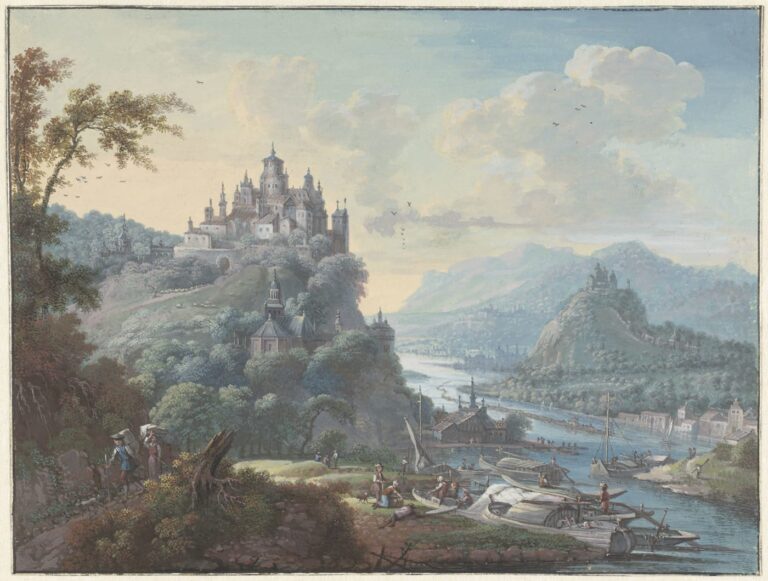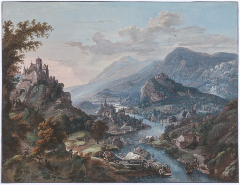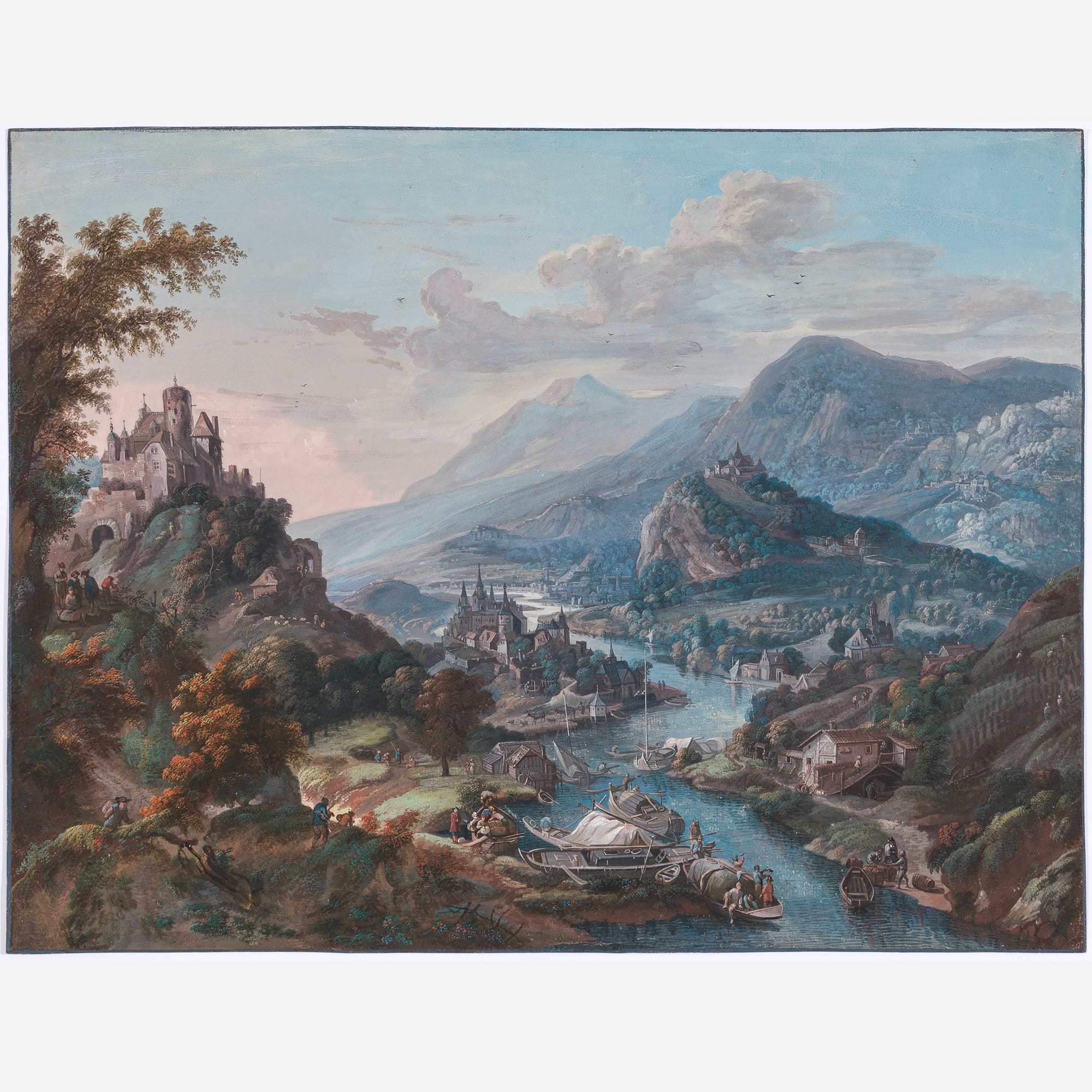 ~ Collection F.J.E. Horstmann, Kasteel Oud Clingendaal, Wassenaar; his sale, Mensing et fils / Frederik Muller & Cie, 19 November 1929, lot 295: ‘J. Griffier – Vue de rivière serpentant à travers une vallée et longeant des rives montagneuses avec des vues de villes et des châteaux; au premier plan des embarcations – aquarelle encadrée. Haut. 38, larg. 49.5 cent’.